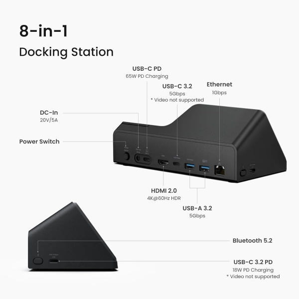 4K@60Hz HDMI portu, 1 DC-In portu (20V/5A), 1Gbps Ethernet portu, 3 USB-C 3.2 portu ve 5Gbps veri aktarımını destekleyen 2 USB-A 3.2 portu ile donatılmış yerleştirme istasyonu.