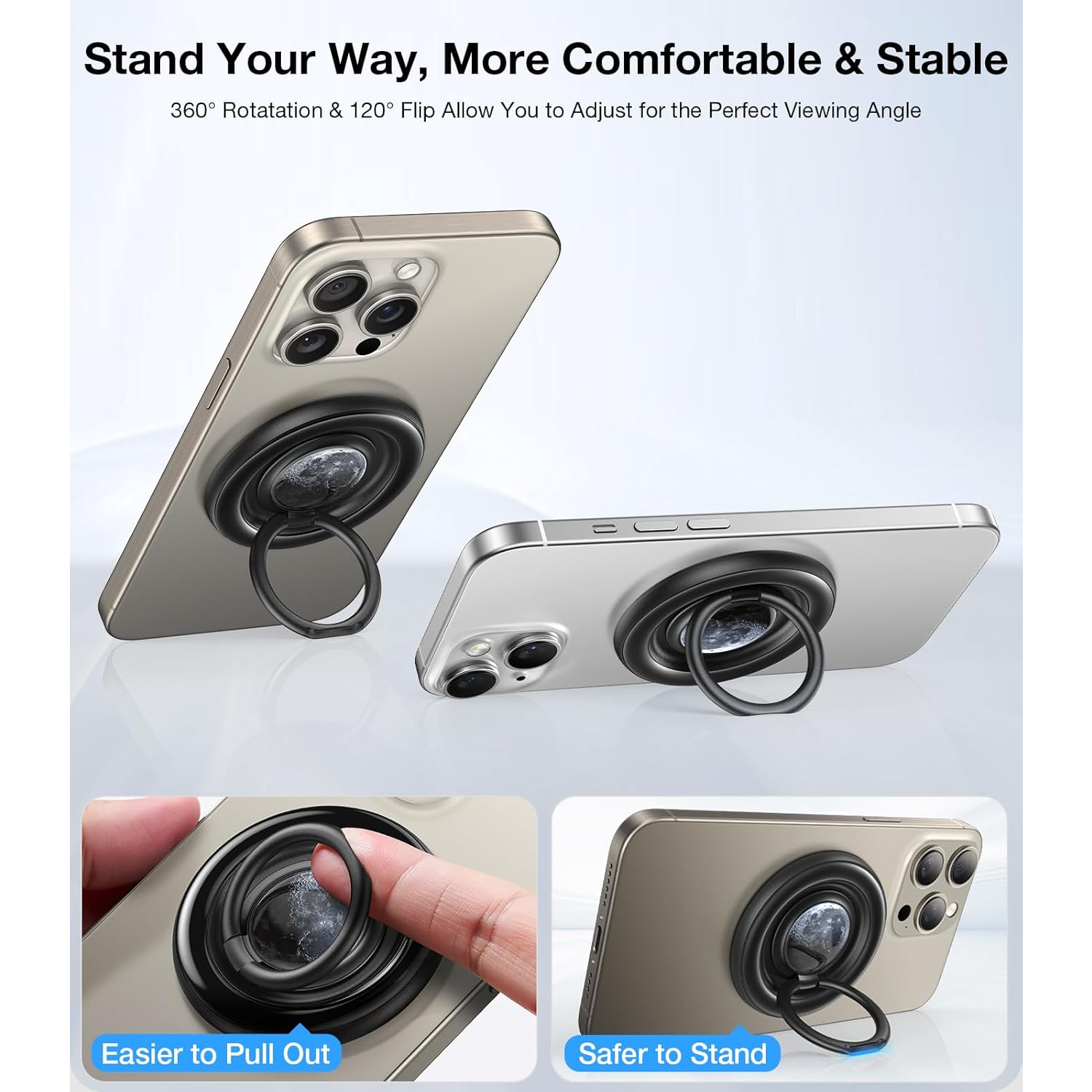 Bu MagSafe halka tutucu standı en iyi tutuş ve görüntüleme açısı için 360° döndürülebilir; video izlerken, selfie çekerken, mesaj yazarken veya görüntülü arama yaparken telefon standı olarak kullanmak için mükemmeldir.