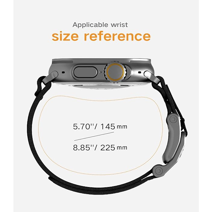 Apple Watch Ultra2/Apple Watch Ultra 49mm ve Apple Watch Series 10 [46mm] 9/8/SE2/7[45MM]6/SE/5/4 [44MM] 3/2/1 [42MM] için. 5,70" (145 mm) - 8,85" (225 mm) bilek ölçülerine uygundur.