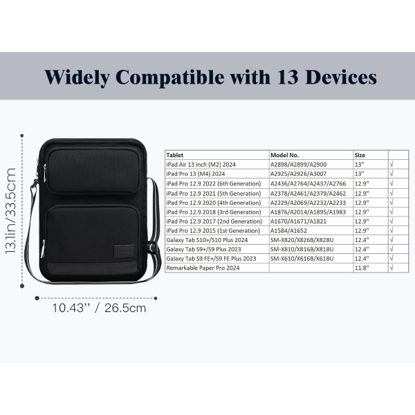Tablet çantası iPad Air 13" (M3 2025/M2 2024), iPad Pro 13", iPad Pro 12.9", Galaxy Tab S9+/S9 Plus/S10+/S10 Plus/S9 FE+/S9 FE Plus 12.4", Remarkable Paper Pro 11.8" ile uyumludur.