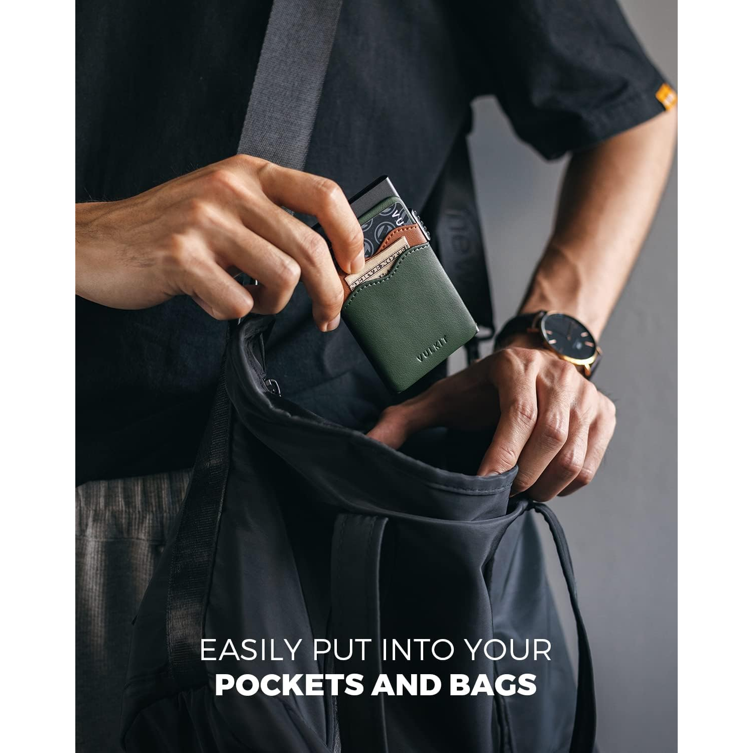 Deri yuvalı cüzdan ve alüminyum kart kılıfı ultra kompakt bir cüzdanla entegre edilmiştir.