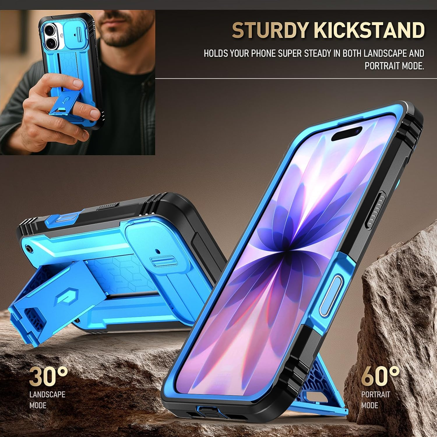 Kickstand özelliğiyle eller serbest kullanıma olanak tanır.