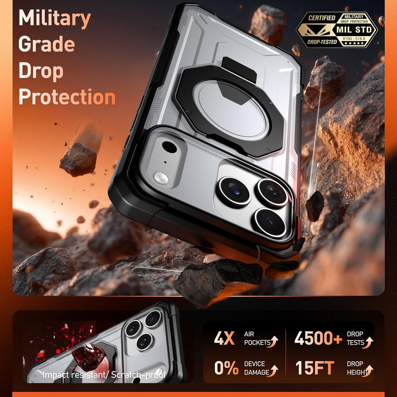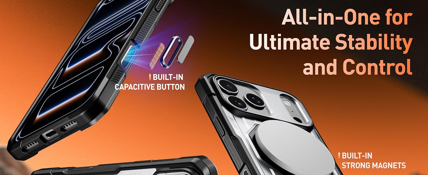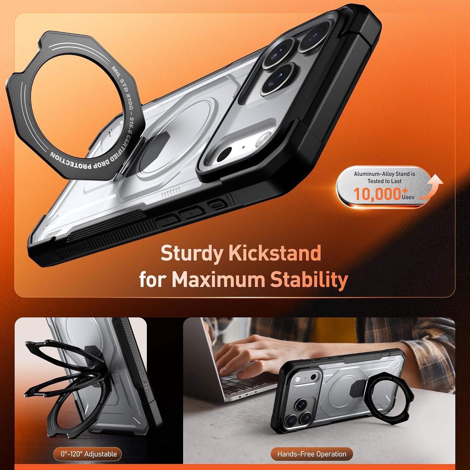 iPhone 17 Pro Kılıfı, en güçlü N52 mıknatıs dizisine sahip gizli bir manyetik Alüminyum Alaşım Halka standı içerir ve 1350 g'a kadar 15N ultra güçlü manyetik kuvvete sahiptir.
