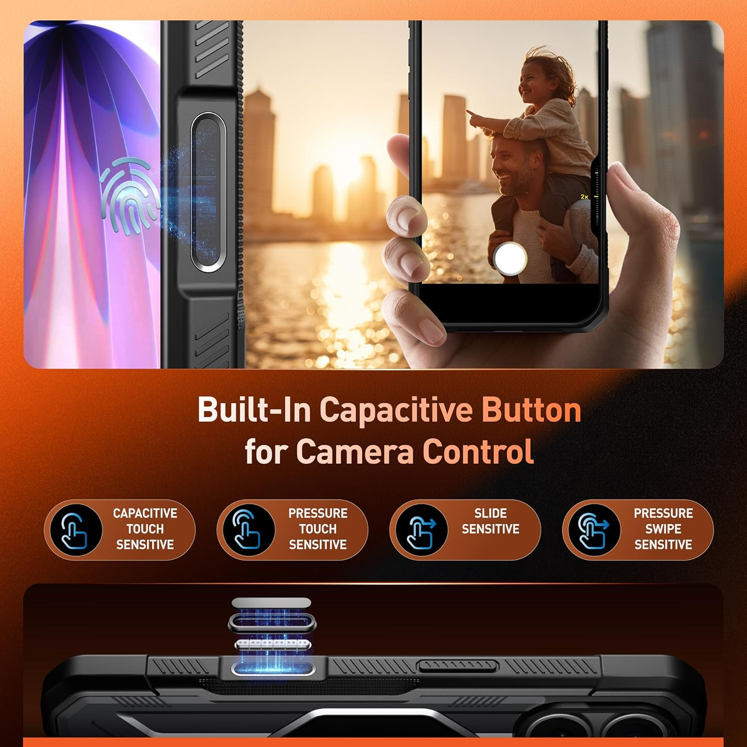 Dahili kamera kontrol yakalama düğmesi, geniş kapsama alanıyla hassas ve duyarlı kontrol sağlar ve iPhone'un kamera düğmesiyle tam uyumlu olup tıklama, basma veya kaydırma yoluyla hızlı ayarlamalar yaparak kusursuz bir deneyim sunar.