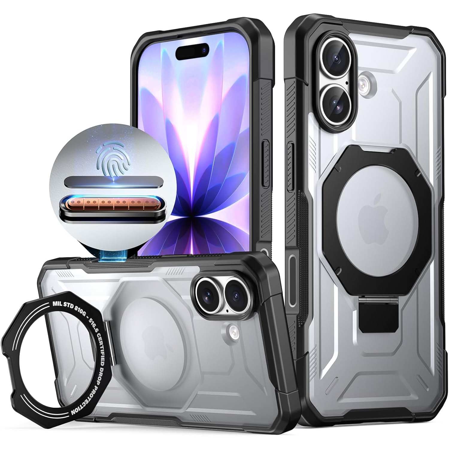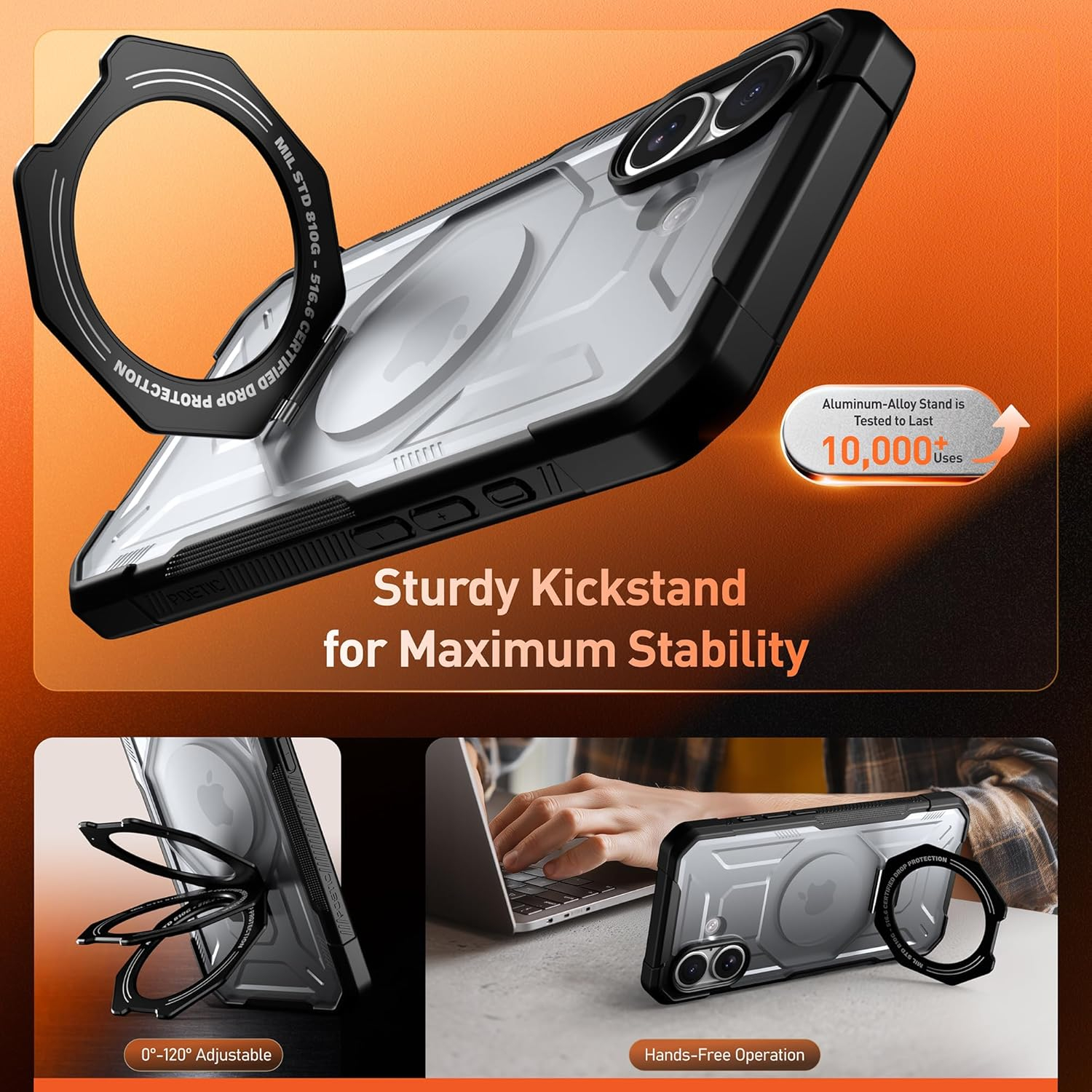 iPhone Kılıfı, en güçlü N52 mıknatıs dizisine sahip gizli bir manyetik Alüminyum Alaşım Halka standı içerir ve 1350 g'a kadar 15N ultra güçlü manyetik kuvvete sahiptir.