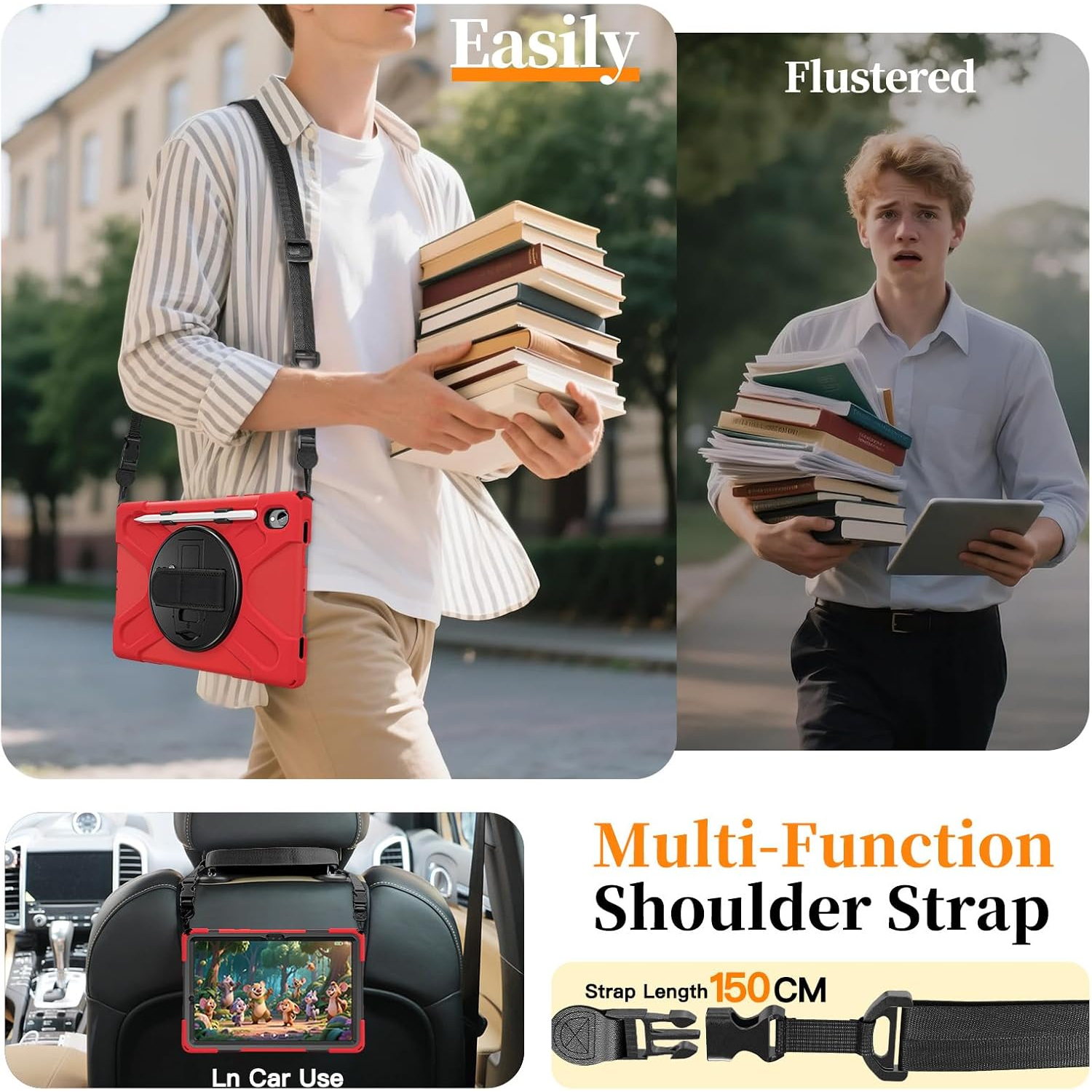 Çıkarılabilir omuz askısı ve dahili el kayışı, hareket halindeyken güvenli kullanım ve üstün taşınabilirlik için dahildir ve kazara düşmeleri önler.