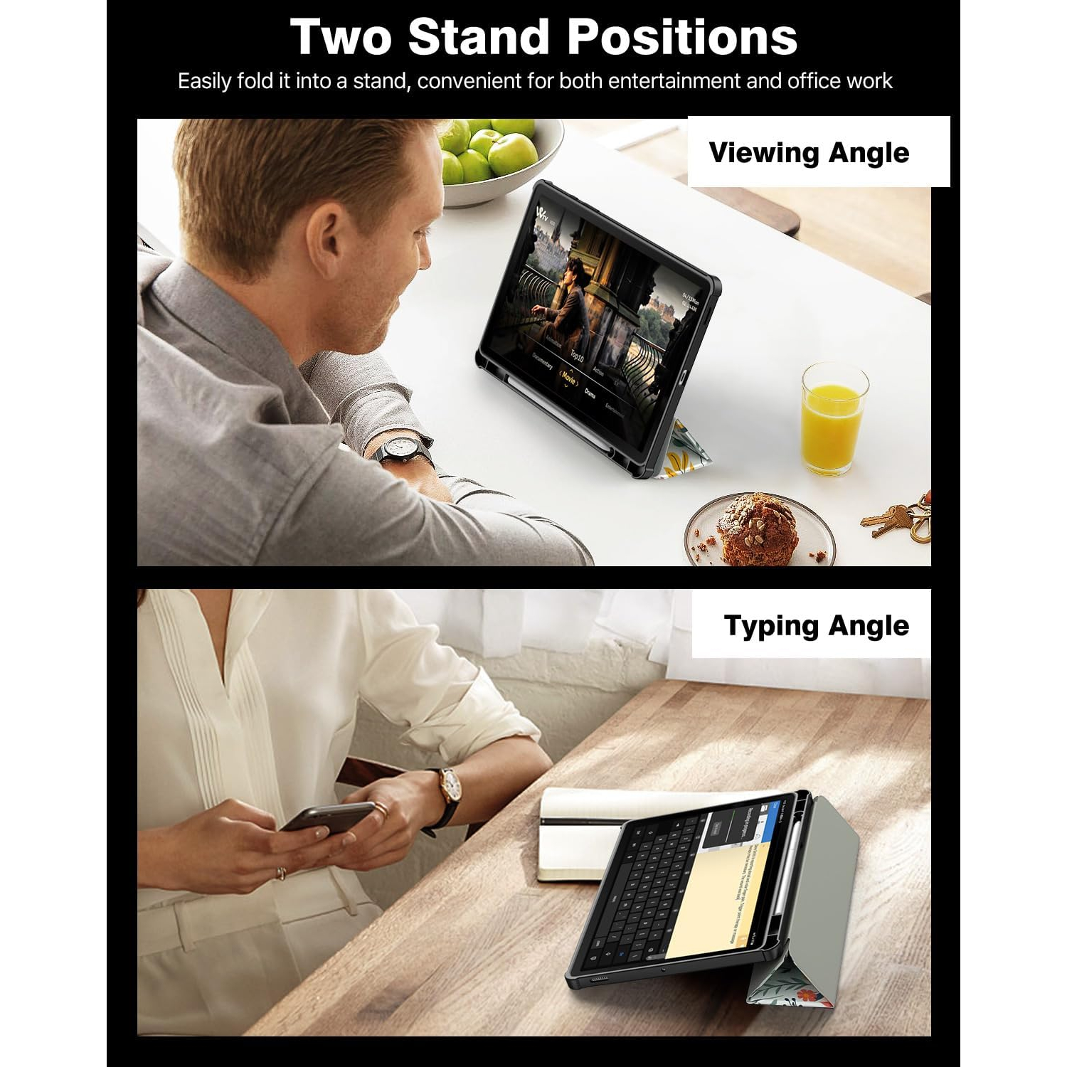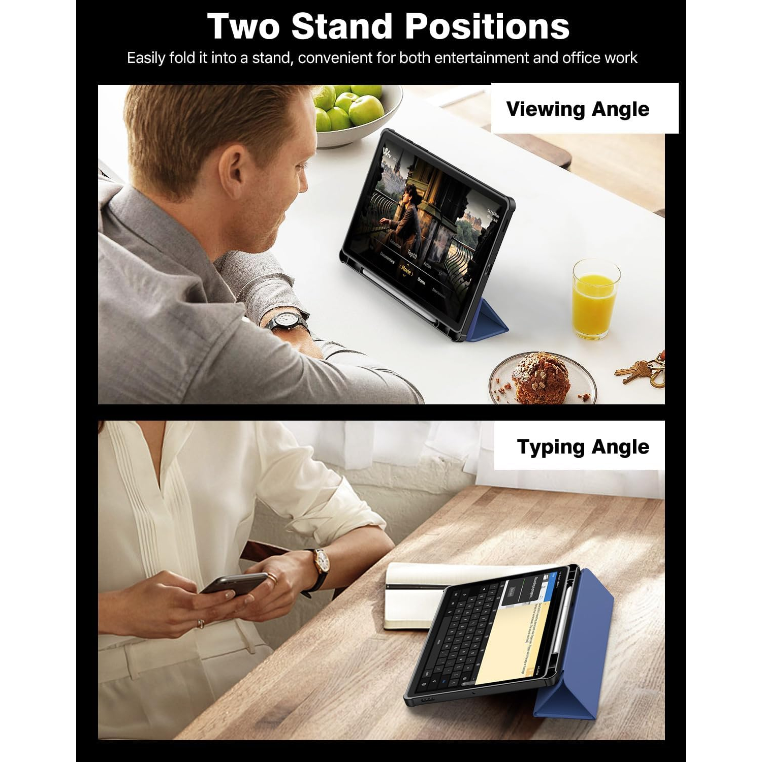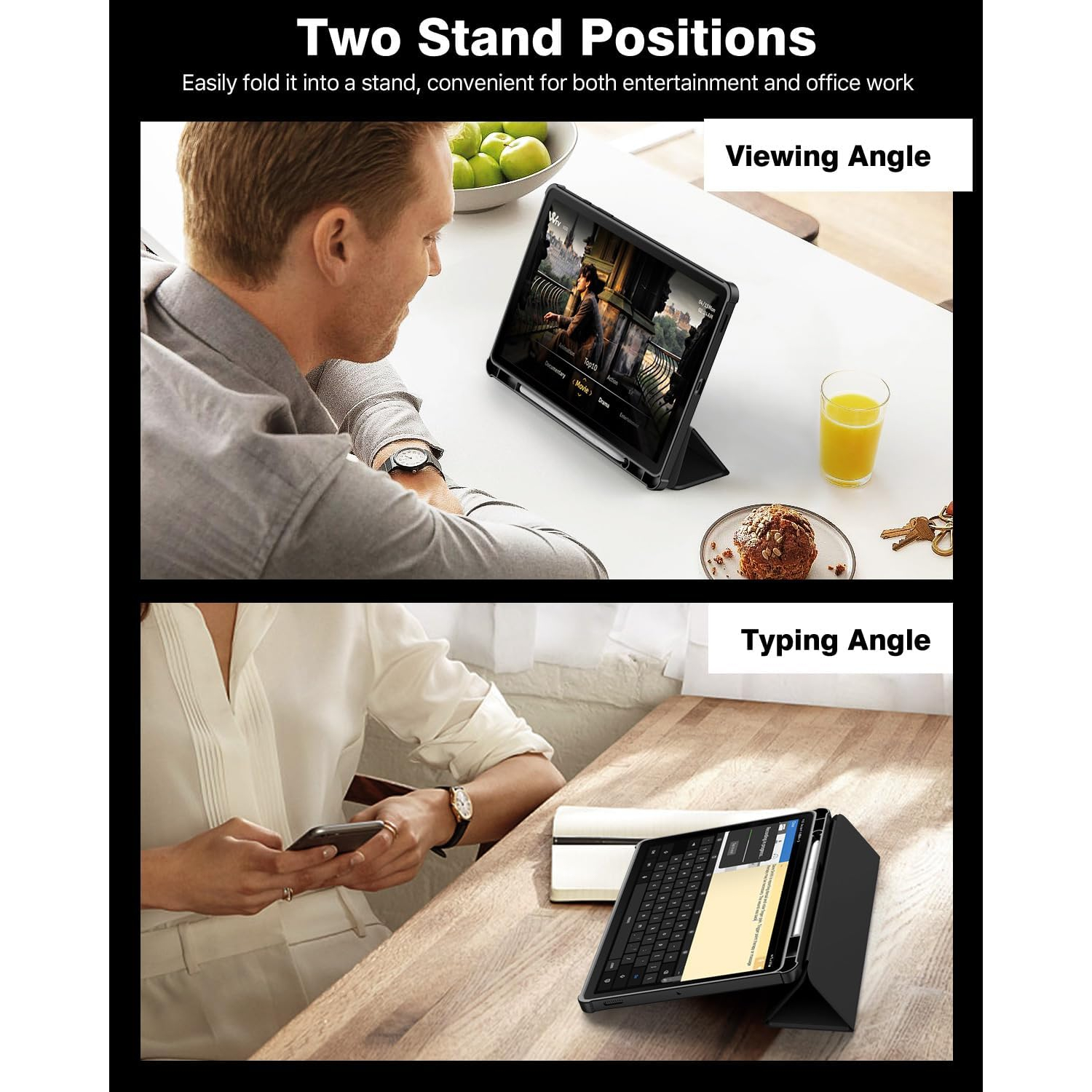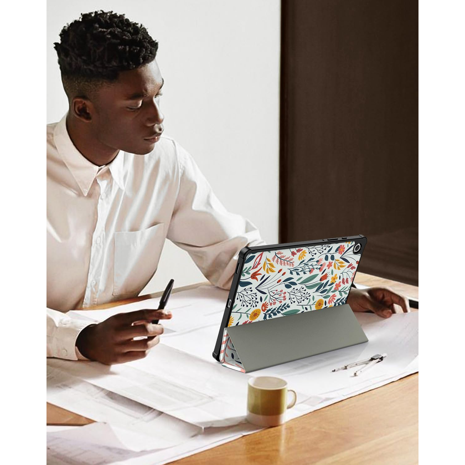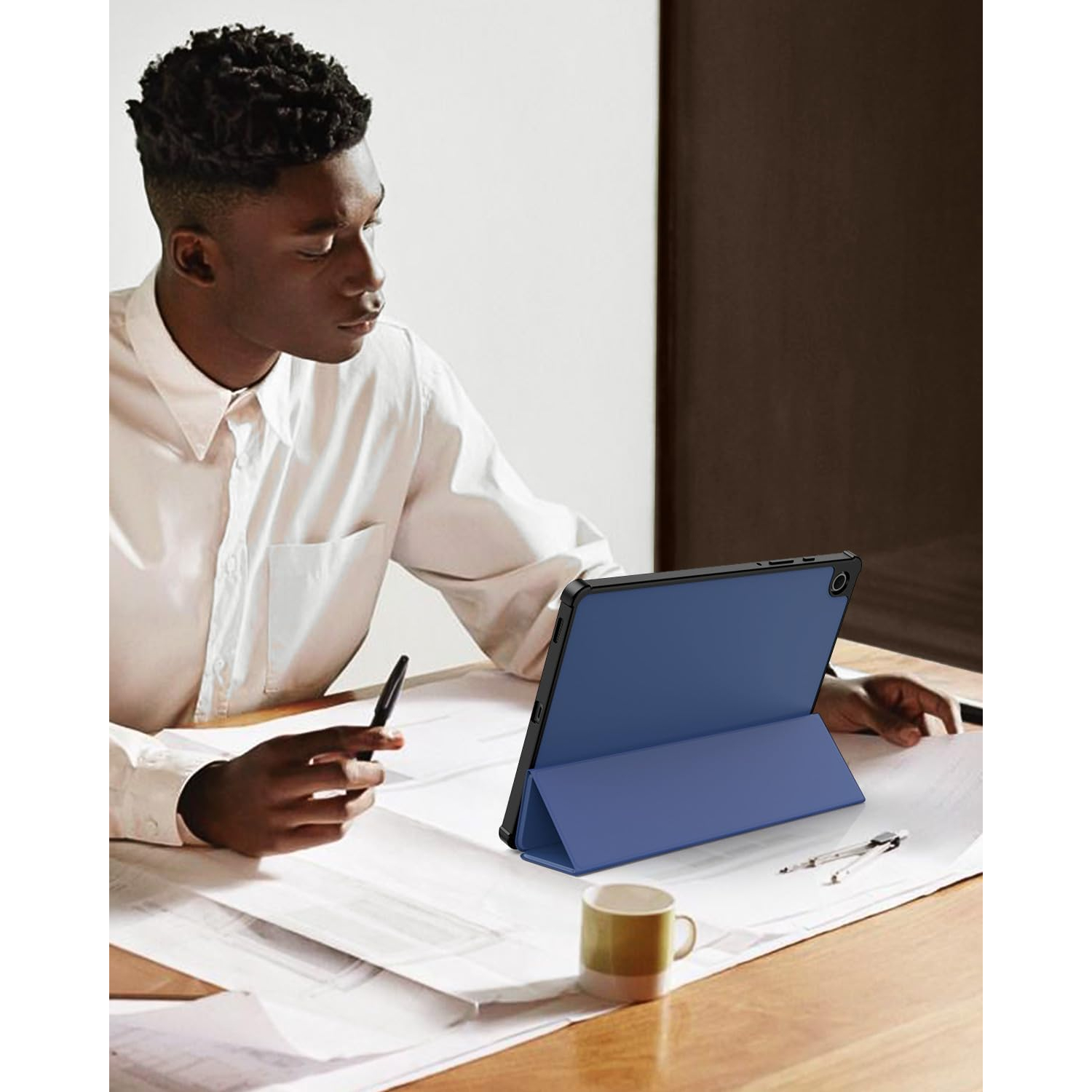 Bu Samsung Galaxy Tab S10 Lite kılıfının üst kısmı, hem görüntüleme hem de yazma için sağlam bir stand pozisyonu sağlayan bir stand oluşturmak üzere geriye doğru katlanabilir.