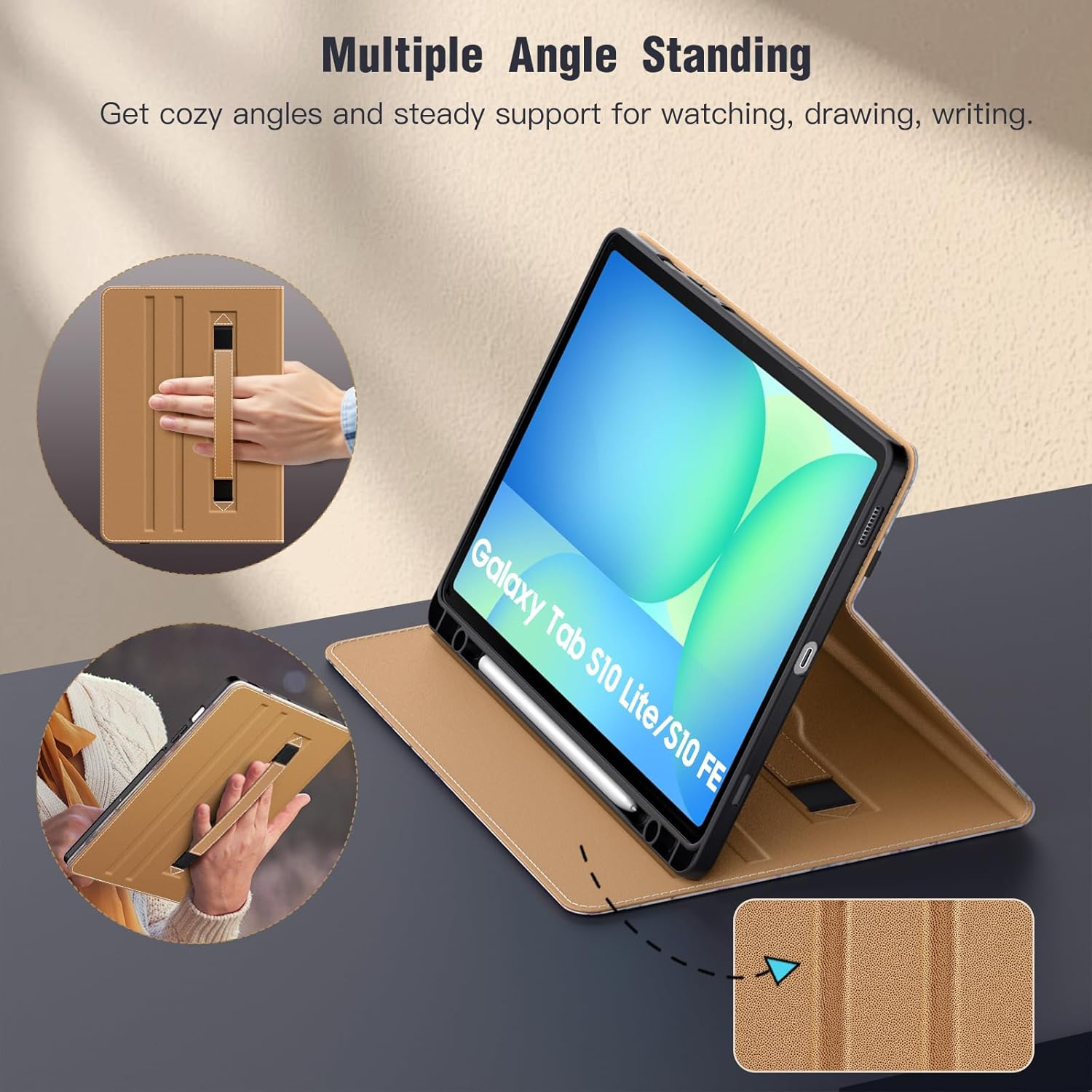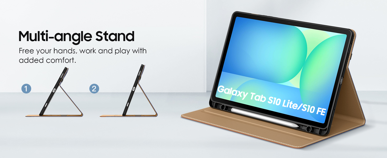 2 kaymaz oluğa sahip Samsung Galaxy Tab S10 Fe kılıfı, ister video izleyin, ister internette gezinin veya kitap okuyun, görsel keyfinizi artırmak ve ellerinizi serbest bırakmak için rahat bir açıya sahip olmanızı sağlayarak çoklu görüş açıları sunar.