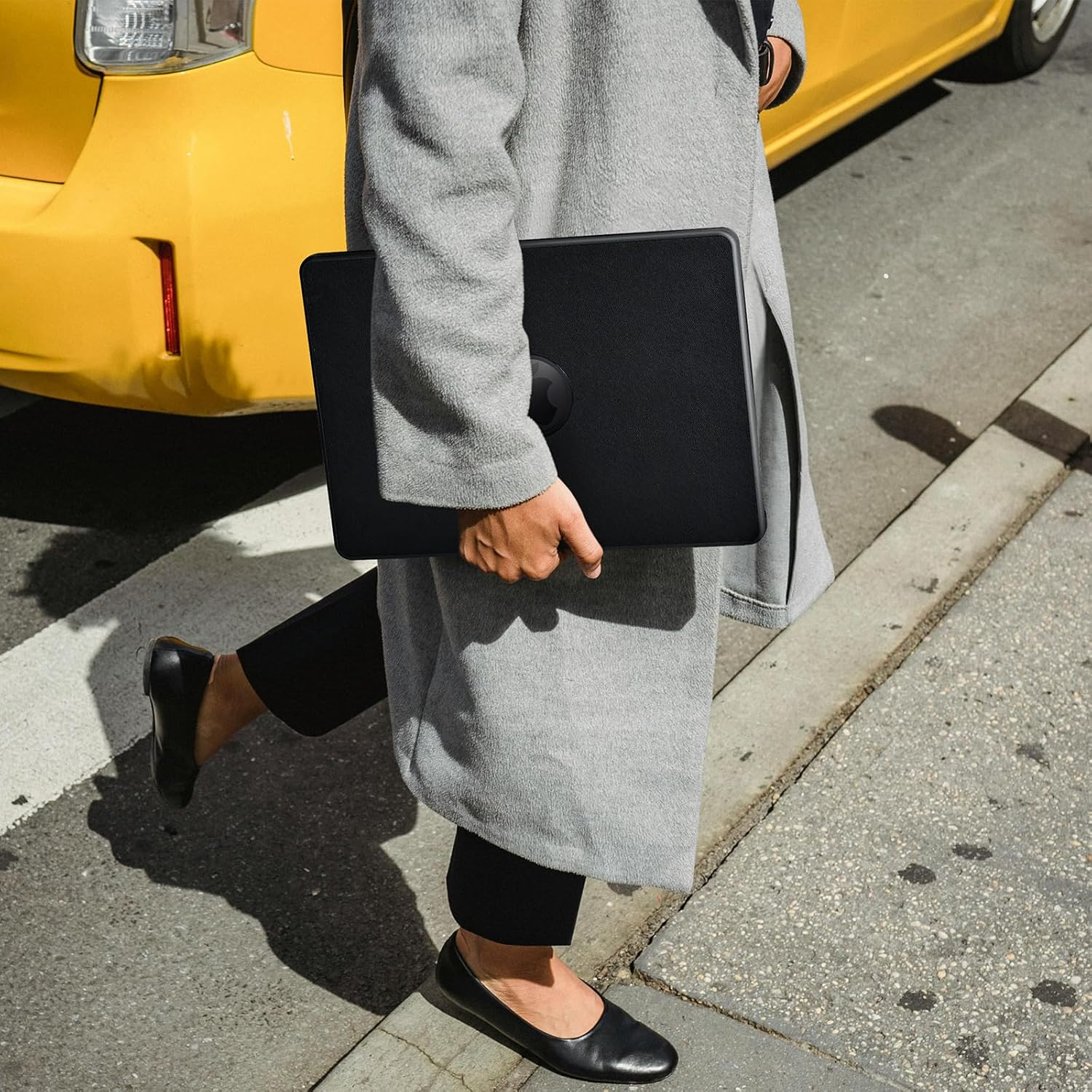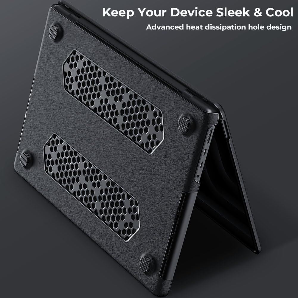 MacBook Pro 14 inç kılıfı için tasarlanmış, her türlü yüzeyde gelişmiş denge ve hava akışı sağlayan yükseltilmiş kauçuk ayaklarla donatılmış bu kılıf, evrak çantalarına ve sırt çantalarına sorunsuz bir şekilde sığar.