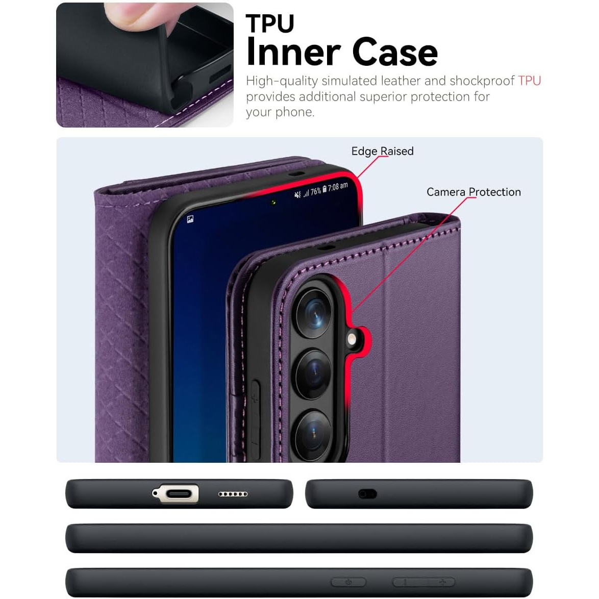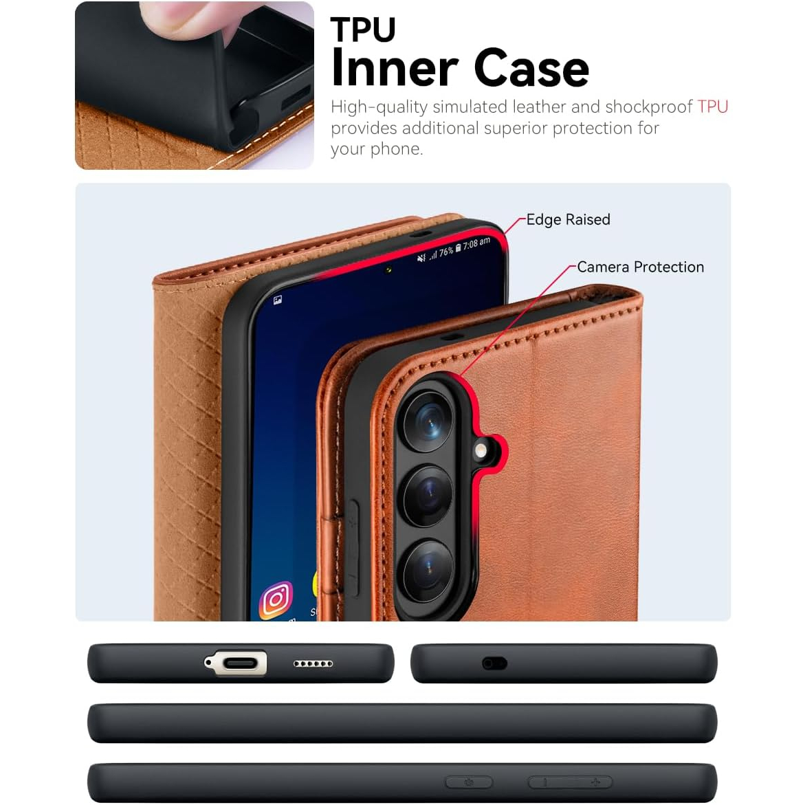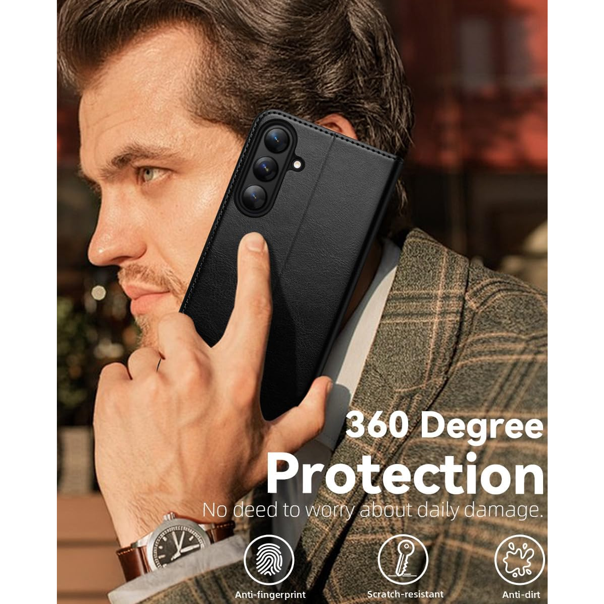 Çizikleri ve parmak izlerini önlemek için birinci sınıf PU yumuşak ve dayanıklı deriden üretilmiştir, doğal yüzey dokusu rahatlatıcı ve lüks bir dokunma hissi sağlar; yükseltilmiş kenarlı ve ekstra yastıklamalı TPU iç kabuk, her yönden darbeye dayanıklı bir tasarım sunar.