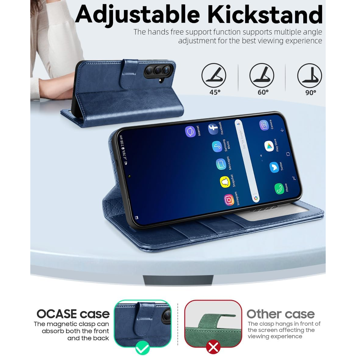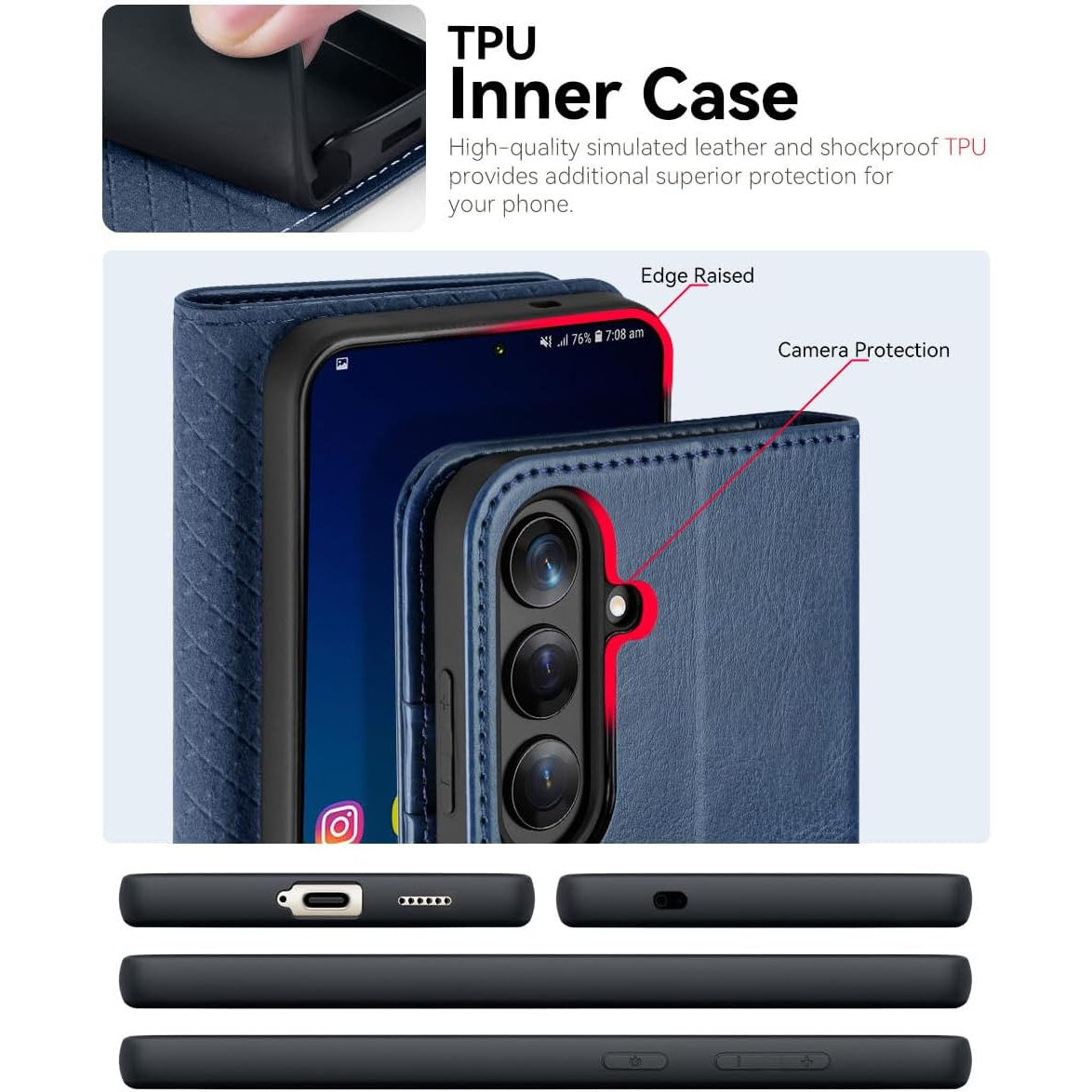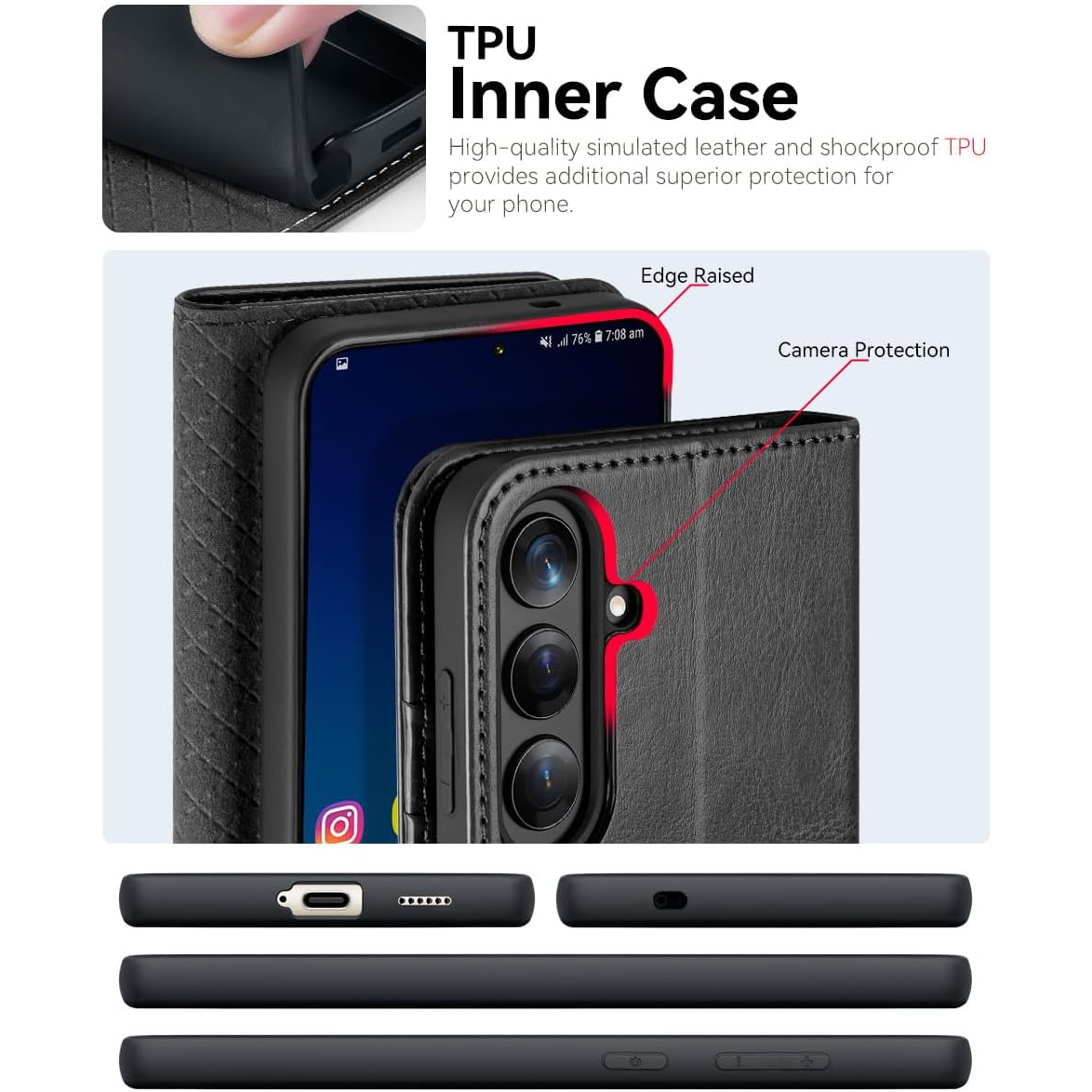 Çizikleri ve parmak izlerini önlemek için birinci sınıf PU yumuşak ve dayanıklı deriden üretilmiştir, doğal yüzey dokusu rahatlatıcı ve lüks bir dokunma hissi sağlar; yükseltilmiş kenarlı ve ekstra yastıklamalı TPU iç kabuk, her yönden darbeye dayanıklı bir tasarım sunar.