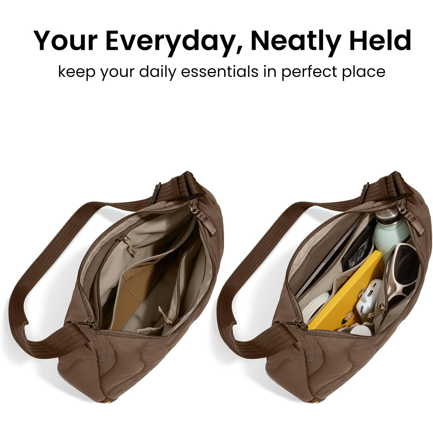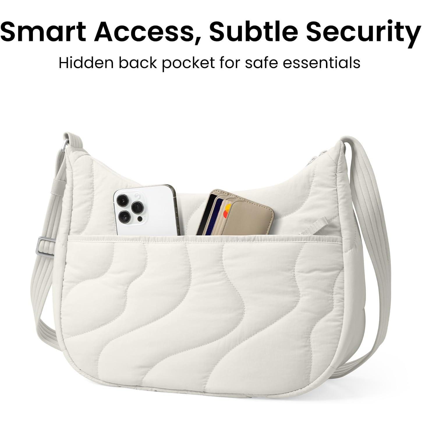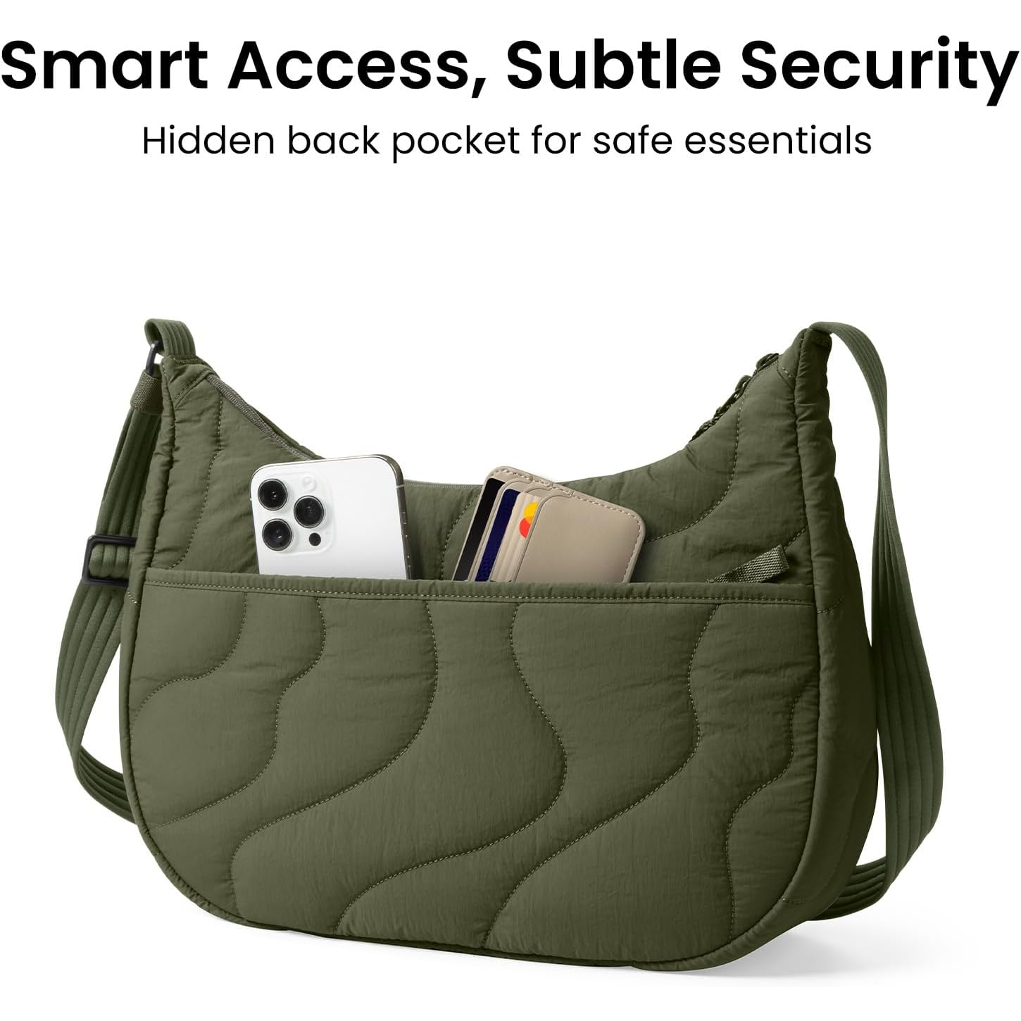 Bu çapraz askılı çanta, fermuarlı bir bölme ve günlük ürünler için özel bir bölme de dahil olmak üzere birden fazla cebe ve hızlı erişim için bir arka cebe sahiptir.