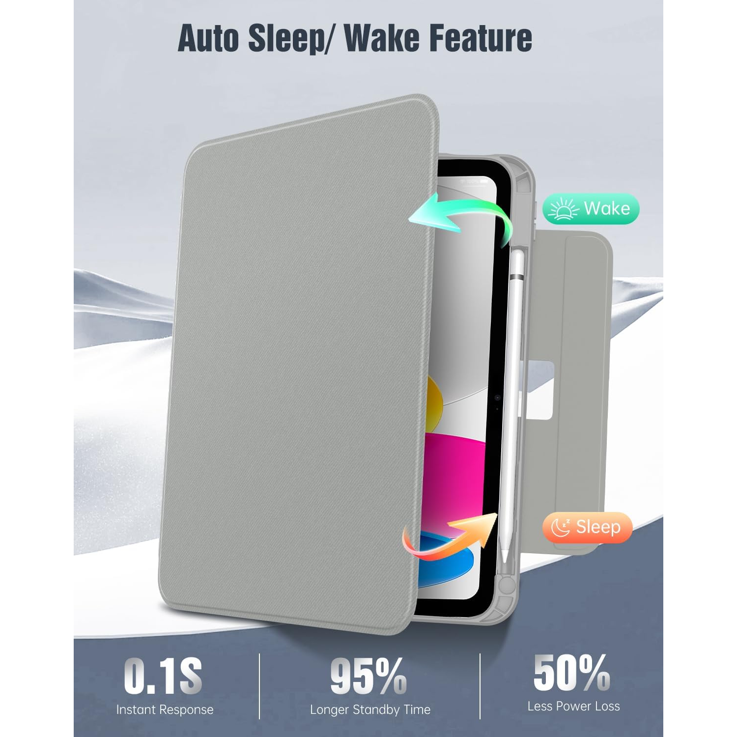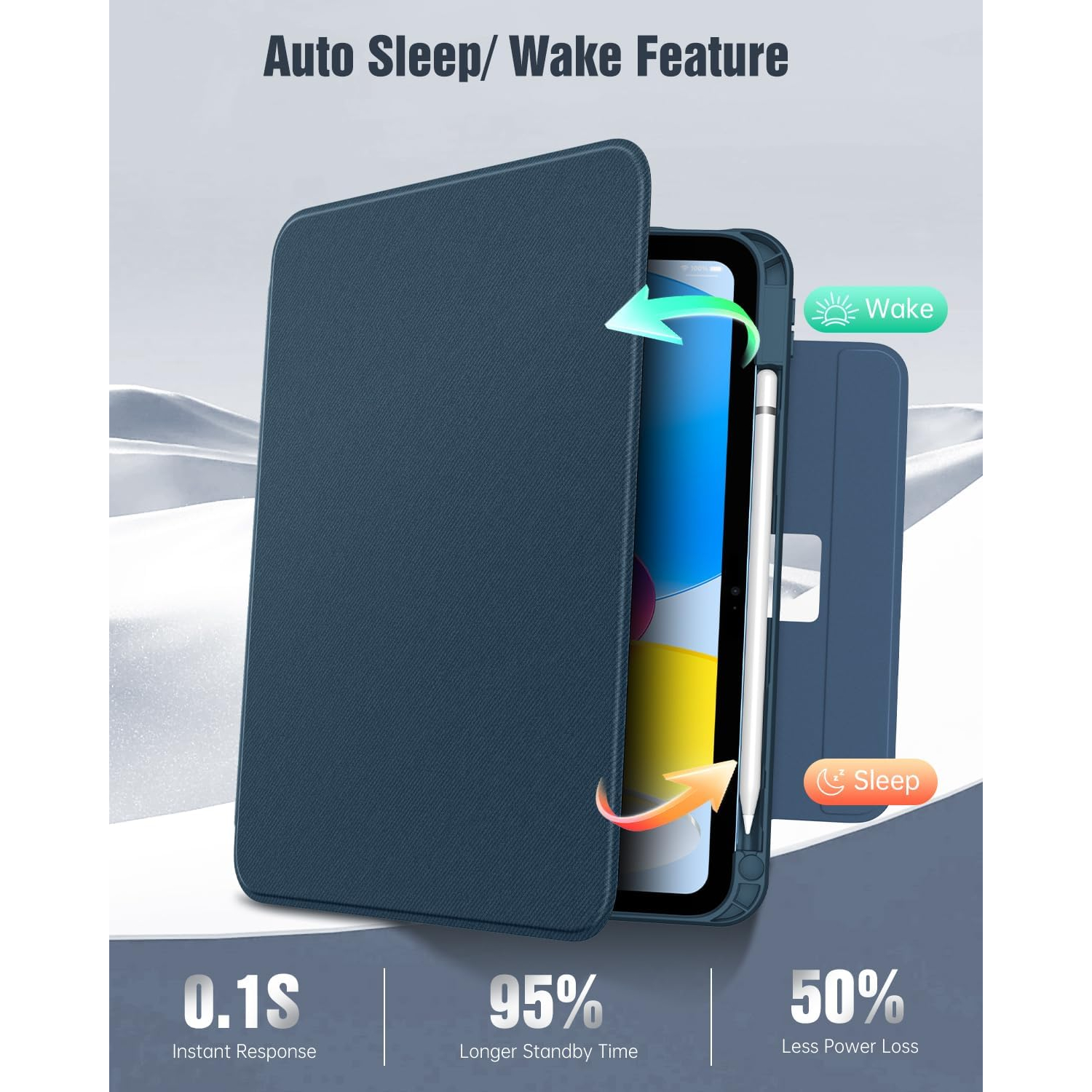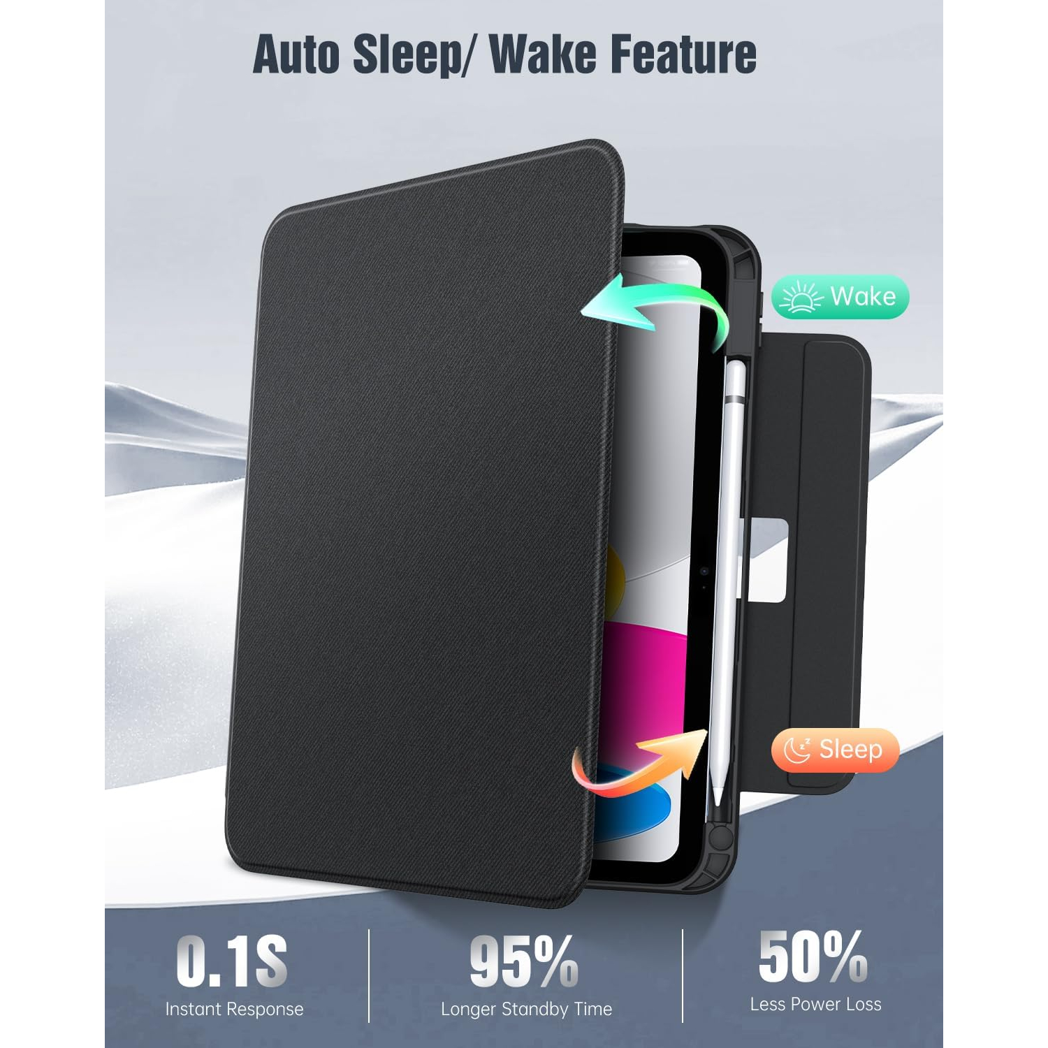 Manyetik akıllı kılıf, otomatik uyandırma/uyku modunu destekleyerek pil tüketimini azaltmaya ve bekleme süresini uzatmaya yardımcı olur. Güçlü manyetik toka, kapalıyken A16 iPad kılıfınızı korur.