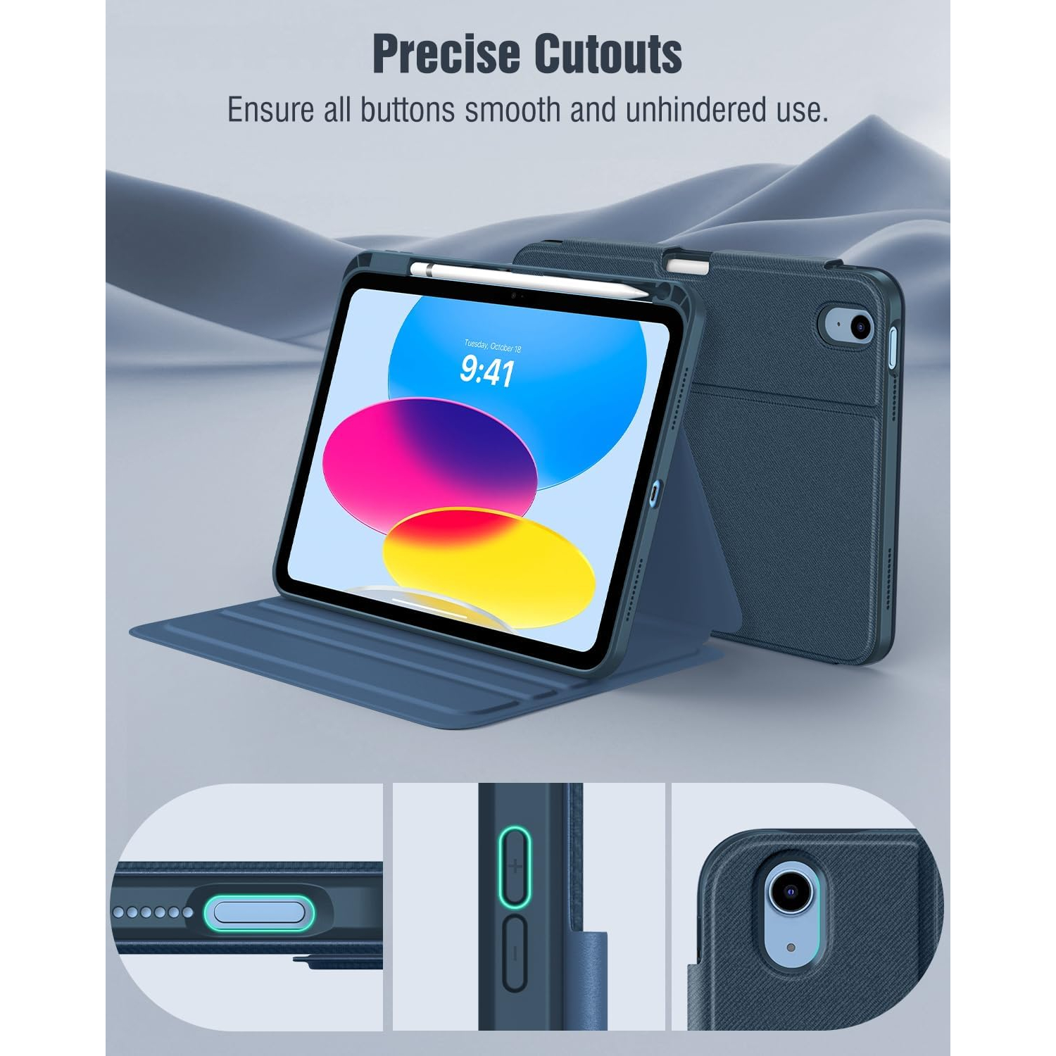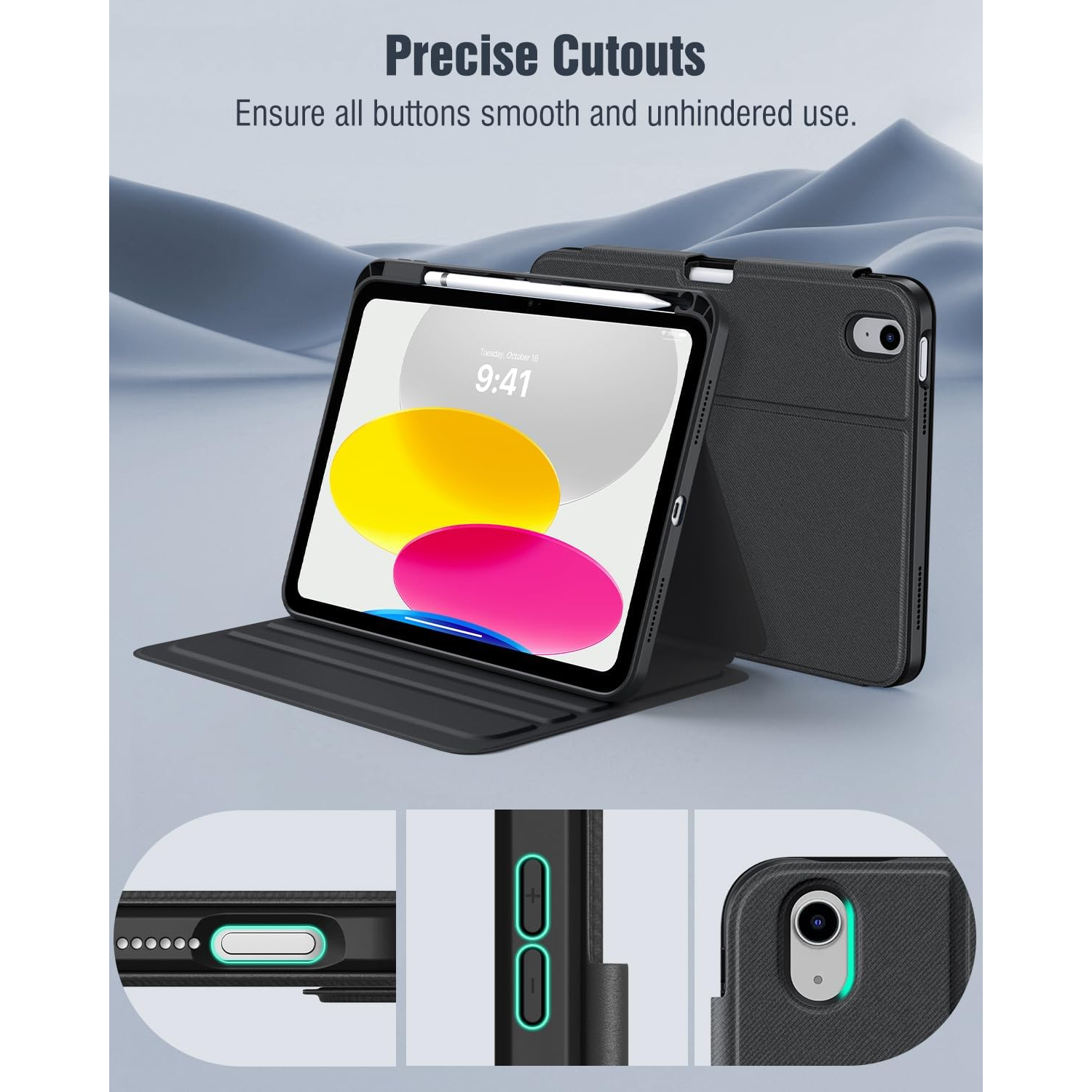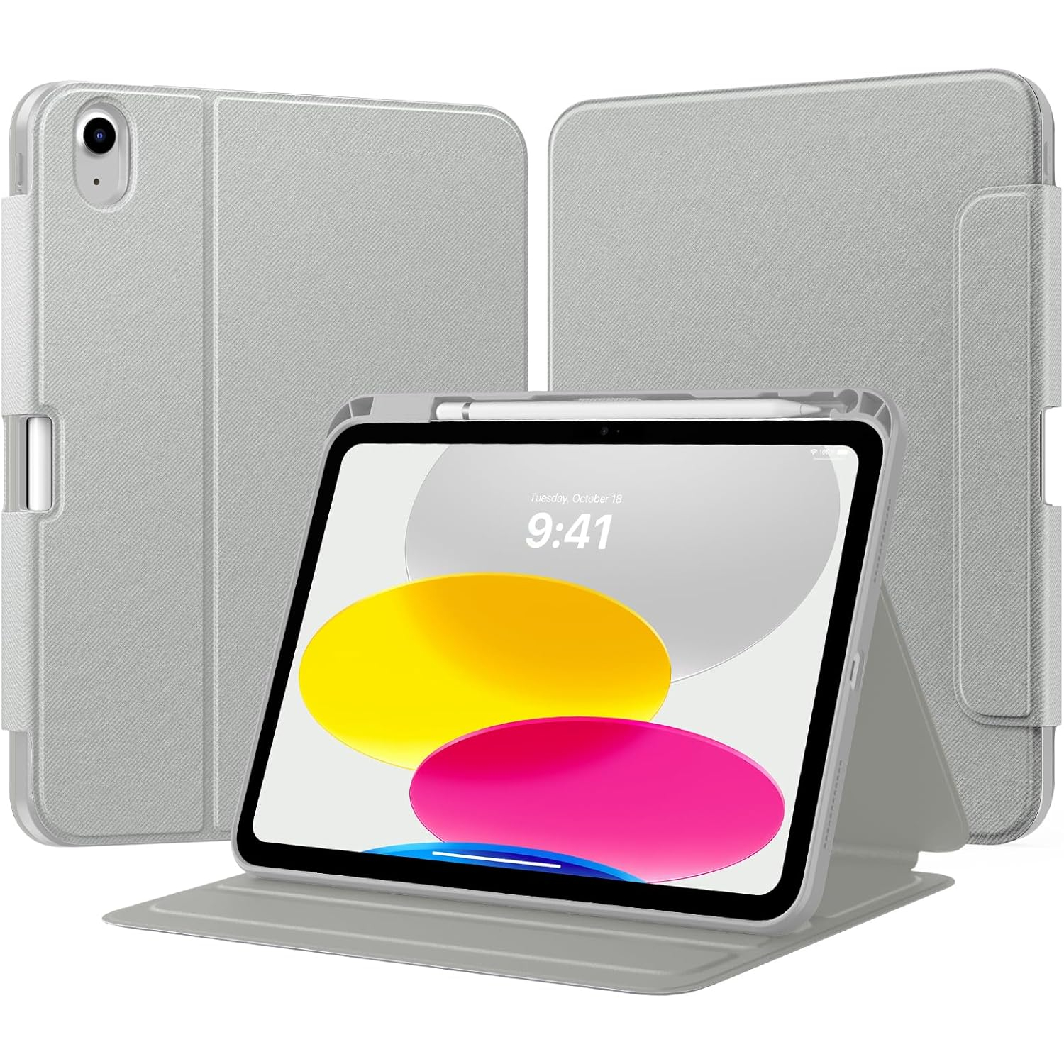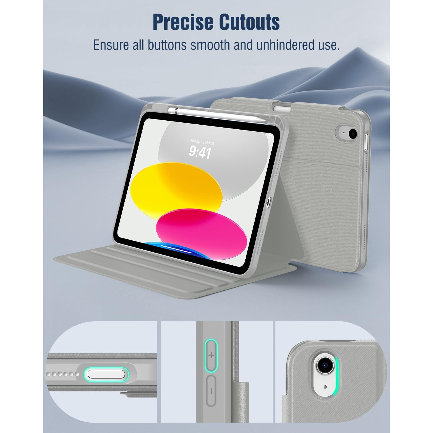 Bu 10. nesil iPad kılıfı, üç açılı ayarlama için yerleşik oluklara sahiptir.