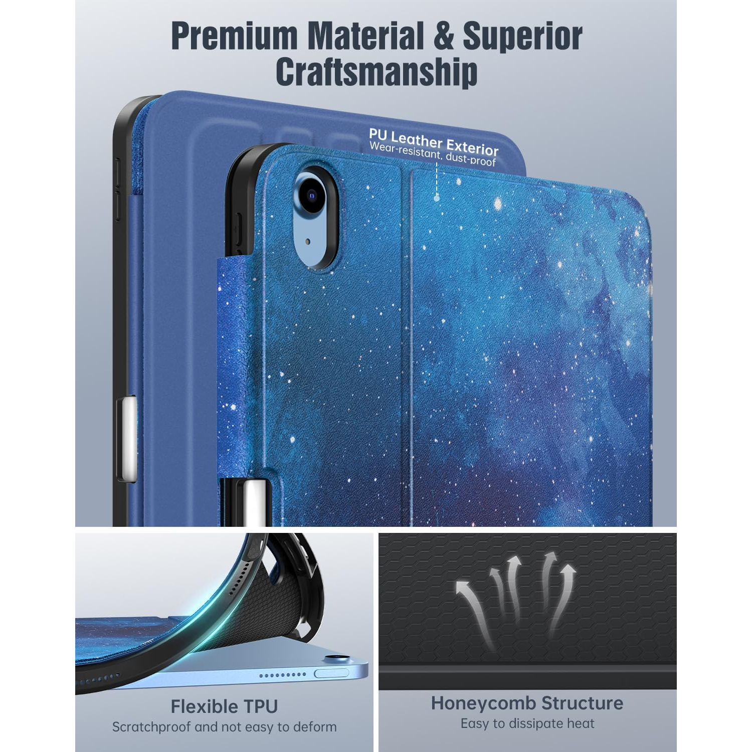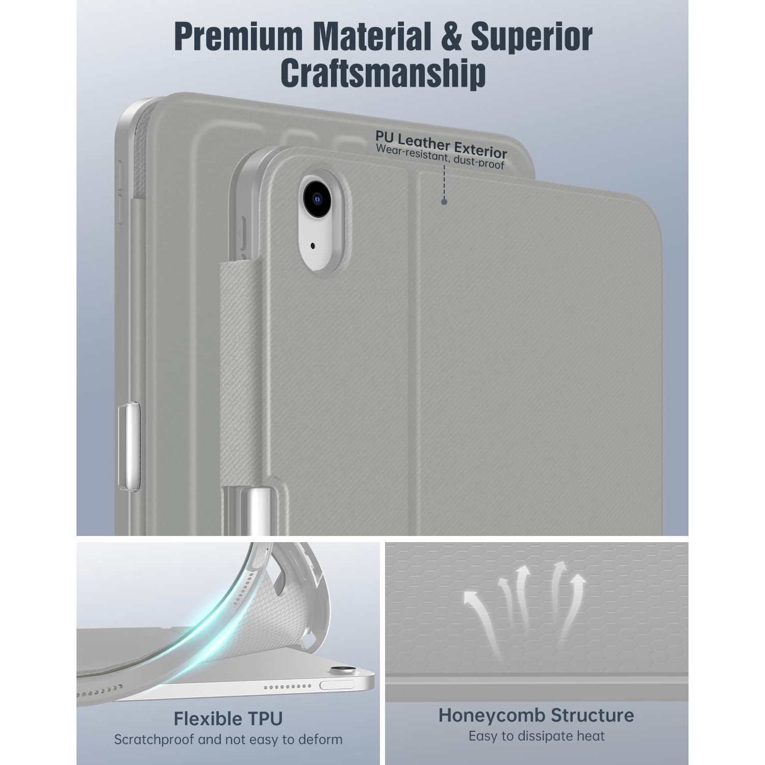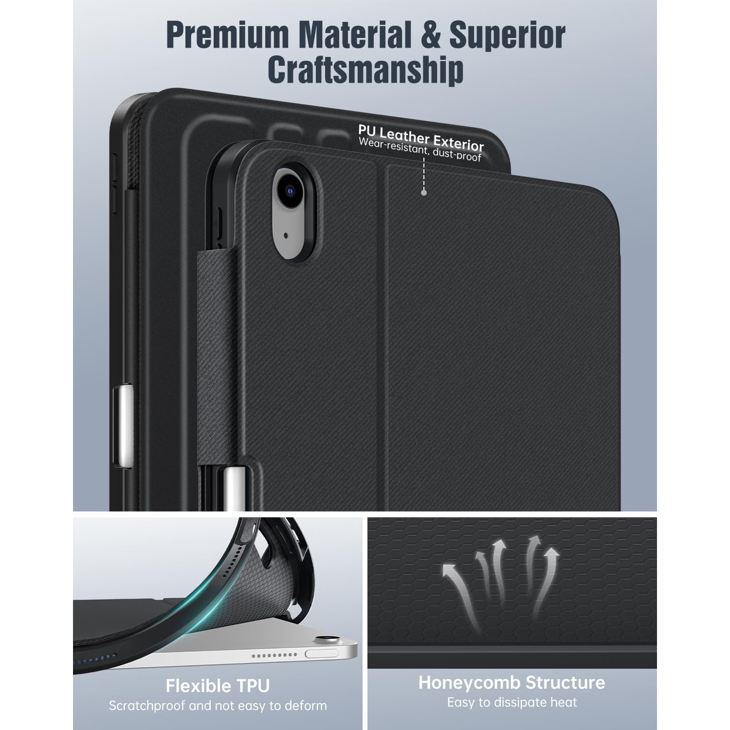 iPad A16 kılıfı, iPad'inizi çizilmelere karşı koruyan birinci sınıf PU deri dış yüzey, yumuşak mikrofiber iç yüzey ve esnek TPU arka yüzeyden üretilmiştir.