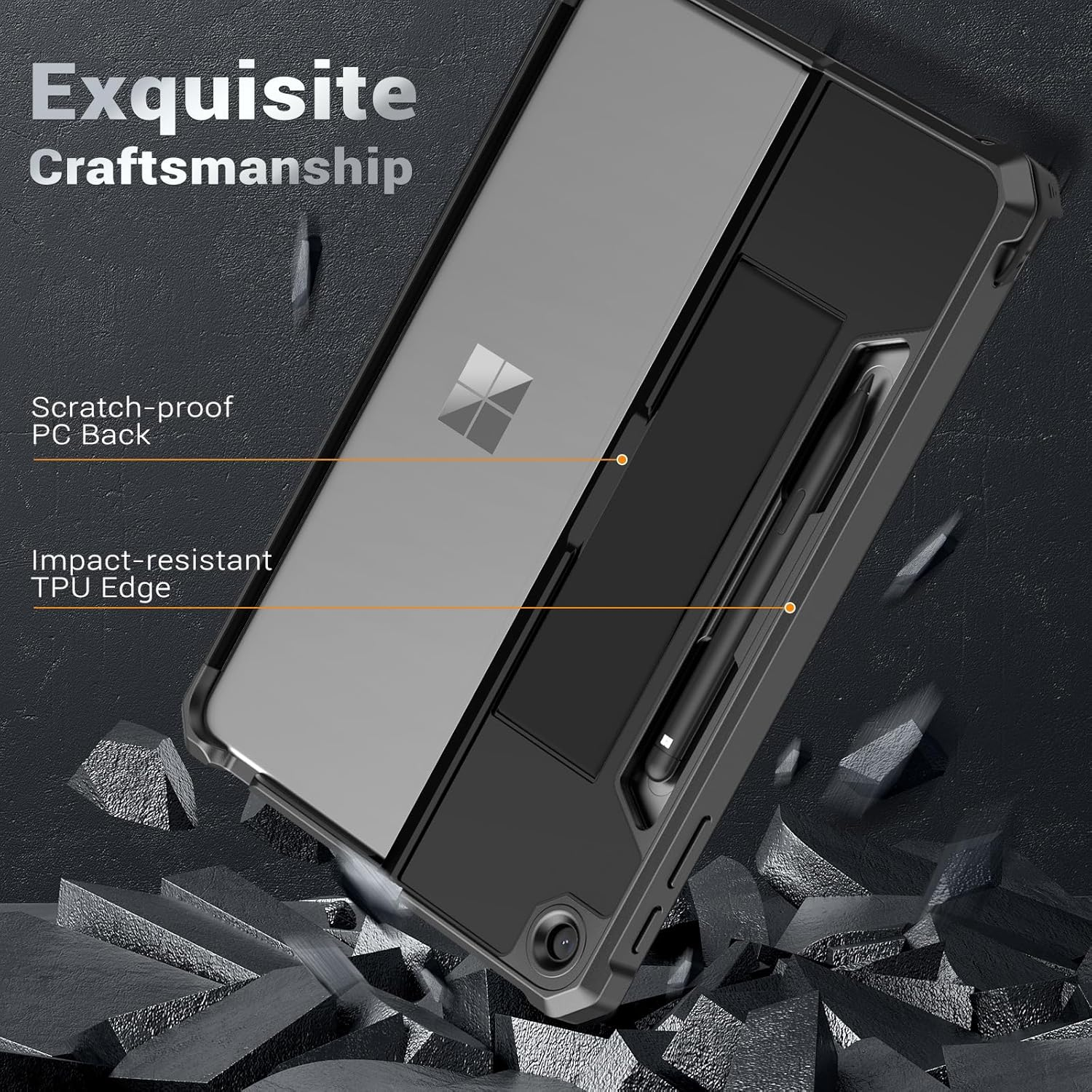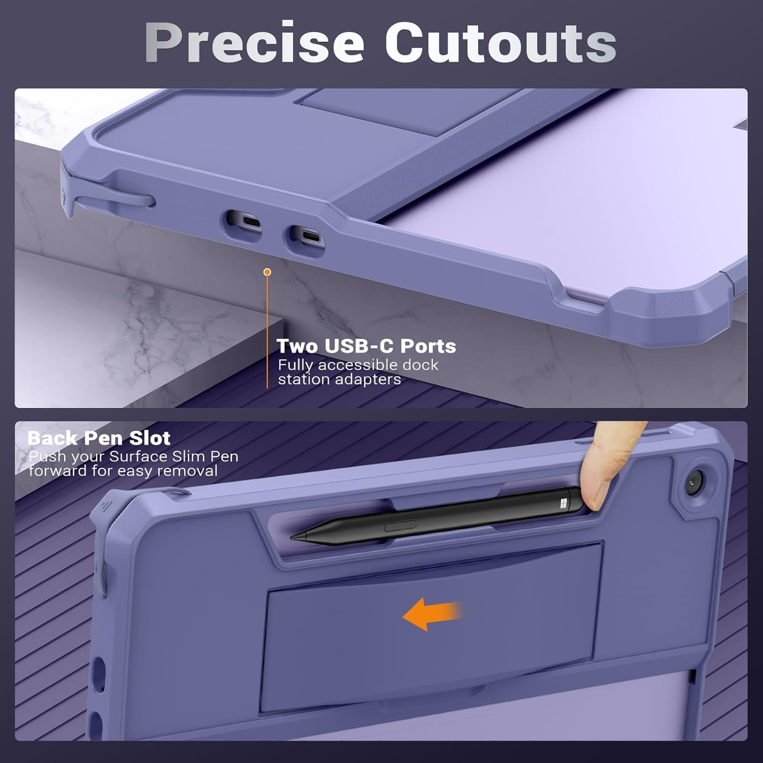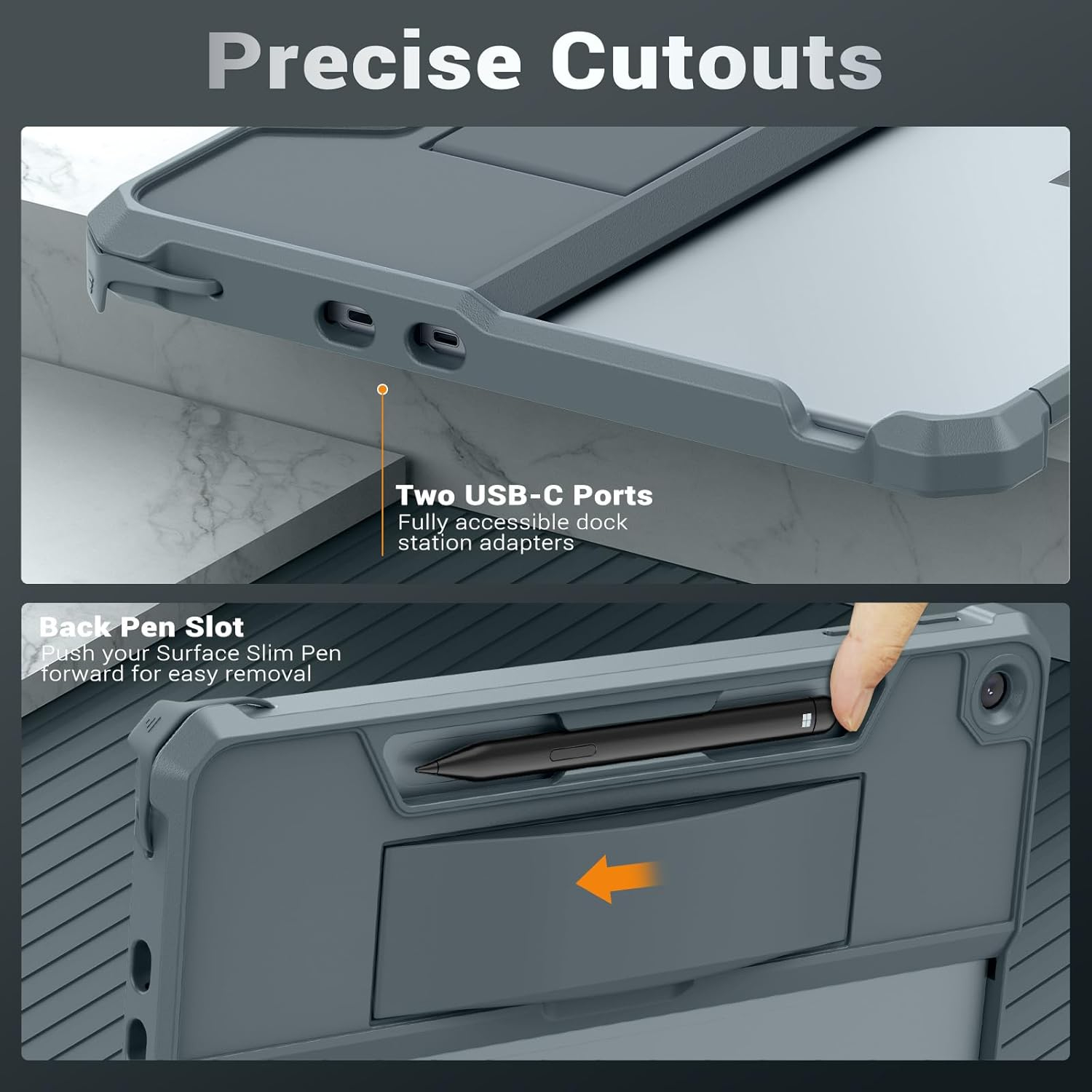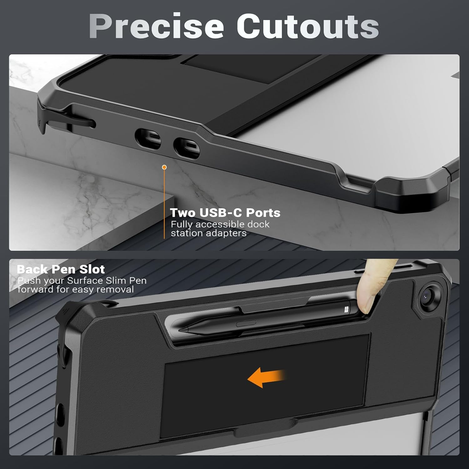 Microsoft Surface Pro 12 inç 2025 için hassas kesimli, hassas kılıf, tüm kontrollere kolay erişim sağlar ve tabletin kılıfı çıkarmadan iki USB-C bağlantı noktasına bir dock istasyonu adaptörü takmasını sağlar.