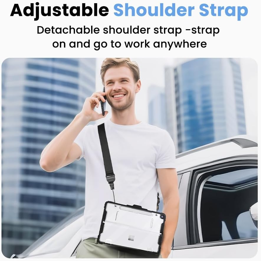Surface Pro (2025) cihazınızın düşmesini önler. Ayrıca, çıkarılabilir omuz askısı, dışarı çıktığınızda cihazınızı yanınızda taşımanıza olanak tanır.
