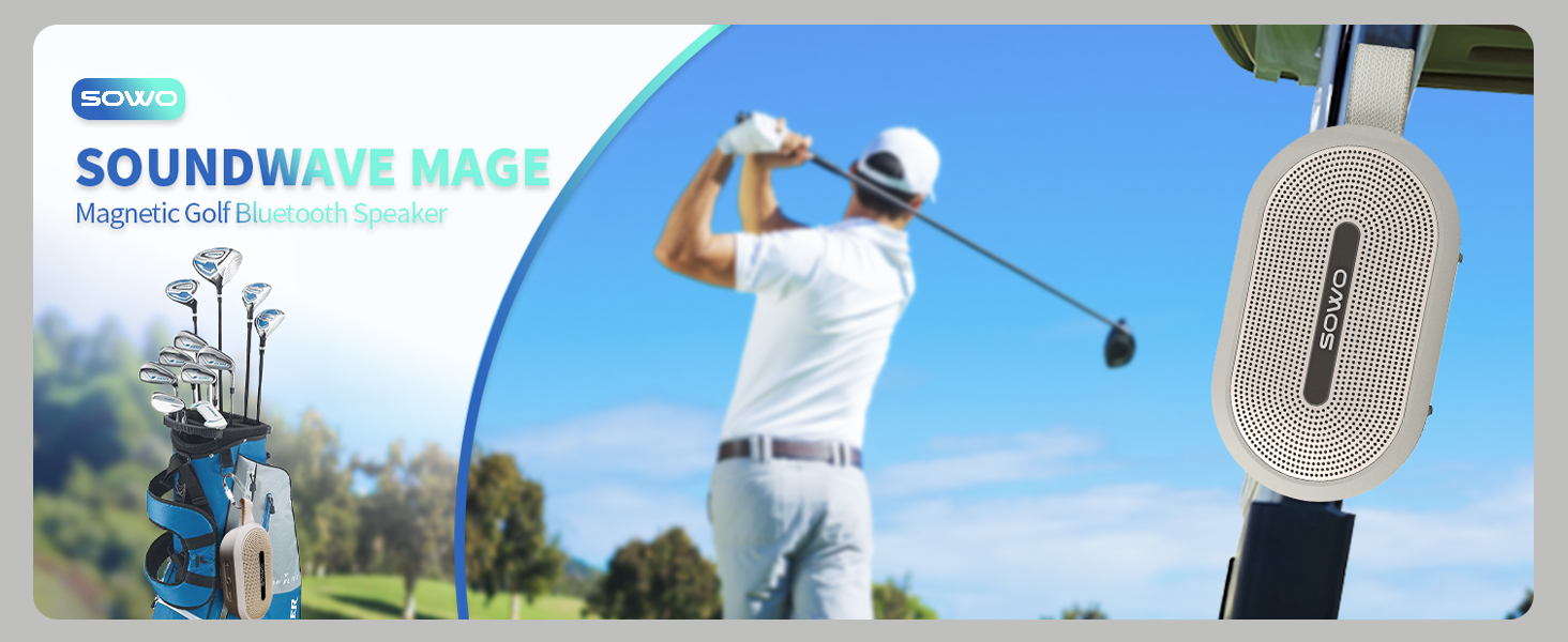 Golf sahasında, golf arabasına kolayca takılabilen ve aynı anda iki hoparlörü eşleştirerek surround ses oluşturabilen Bluetooth hoparlörler kullanılıyor.