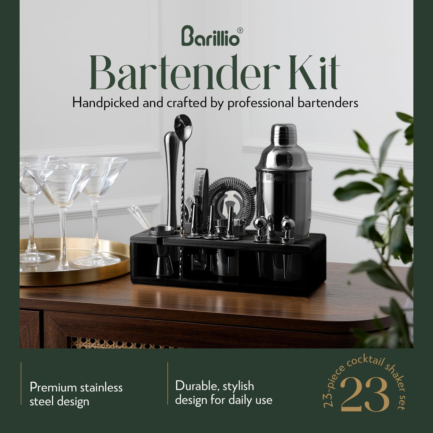 BARTENDİNG SETİ: Barmenler tarafından tasarlanan bu 23 parçalık bar alet seti, göz alıcı siyah ayna kaplamasına sahiptir ve göz alıcı siyah bambu standında sunulmaktadır. Evinizin konforunda lezzetli kokteyller hazırlamak için ihtiyacınız olan tüm bar aksesuarlarıyla donatılmıştır. - ŞIK SAKLAMA STANDI: Siyah renkteki bu sofistike Japon bambu stand, özel mutfak gereçleri tutucularıyla tasarlanmıştır ve barmenlik malzemeleriniz için mükemmel bir şekilde donatılmıştır. Zahmetsiz bir stil ve işlevsellik sunar.