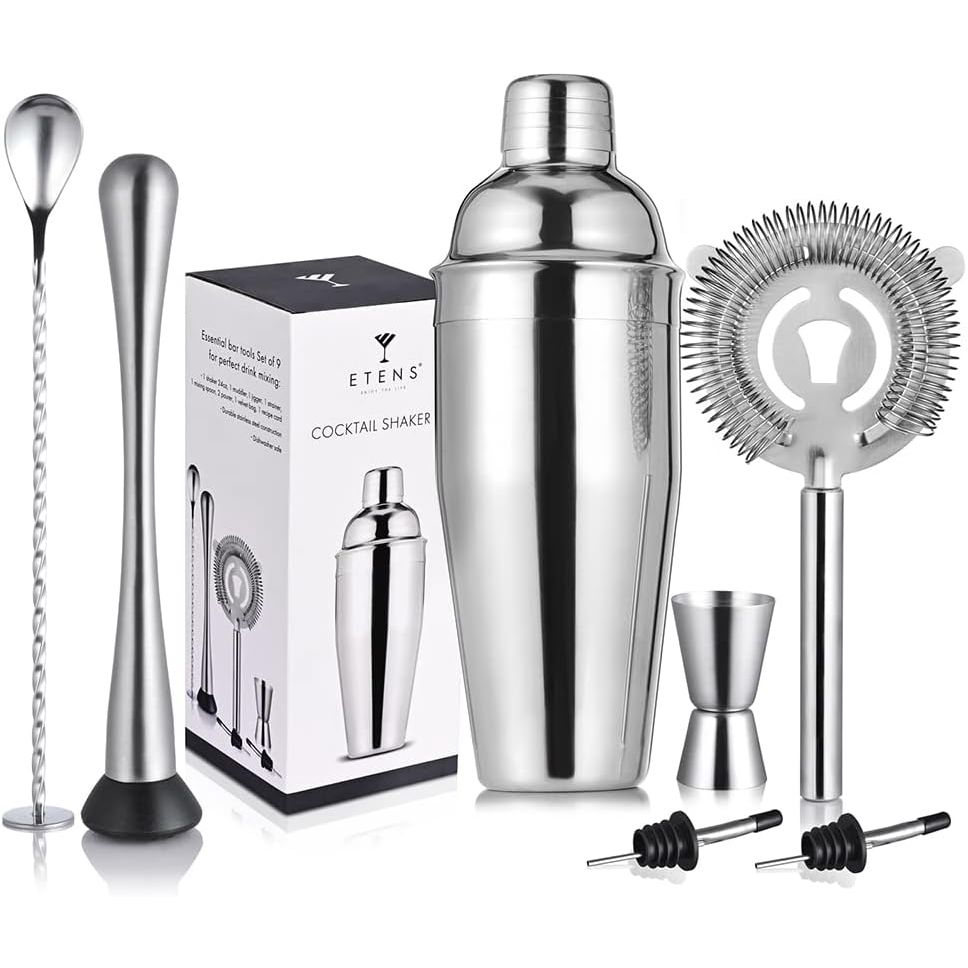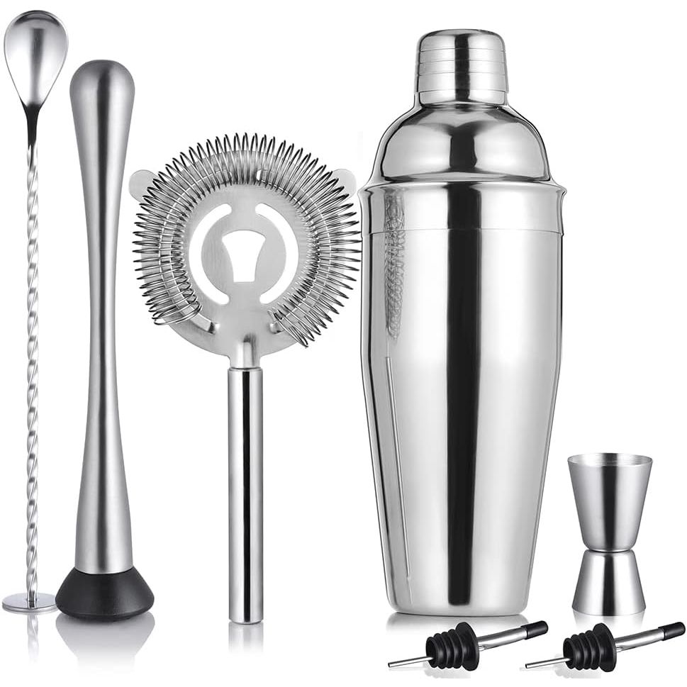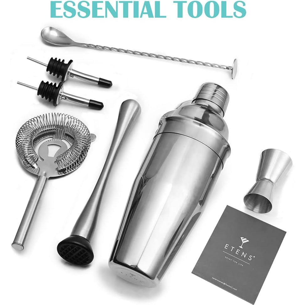 Başlangıç Kokteyl Çalkalayıcı Seti 8 Parça Bir barmenin ihtiyaç duyduğu her şey: 24 ons paslanmaz çelik çalkalayıcı kutusu (martini çalkalayıcı/içecek çalkalayıcı), Hawthorne süzgeci, kokteyller için havan topu, ölçü kabı, bar kaşığı, şarap dökücüler ve tarifler. - Yüksek Etkili İçecek Mikseri Çalkalayıcı Seti Düzenli kullanıma dayanıklı profesyonelce hazırlanmış paslanmaz çelikten üretilmiştir. Kokteyller, margaritalar, karışık içecekler, alkolsüz kokteyller ve kokteyl yapımı için idealdir. - Temiz Dökme için Dahili Süzgeç Hawthorne süzgeçlerine ek olarak, entegre çalkalayıcılarımız bulunur.