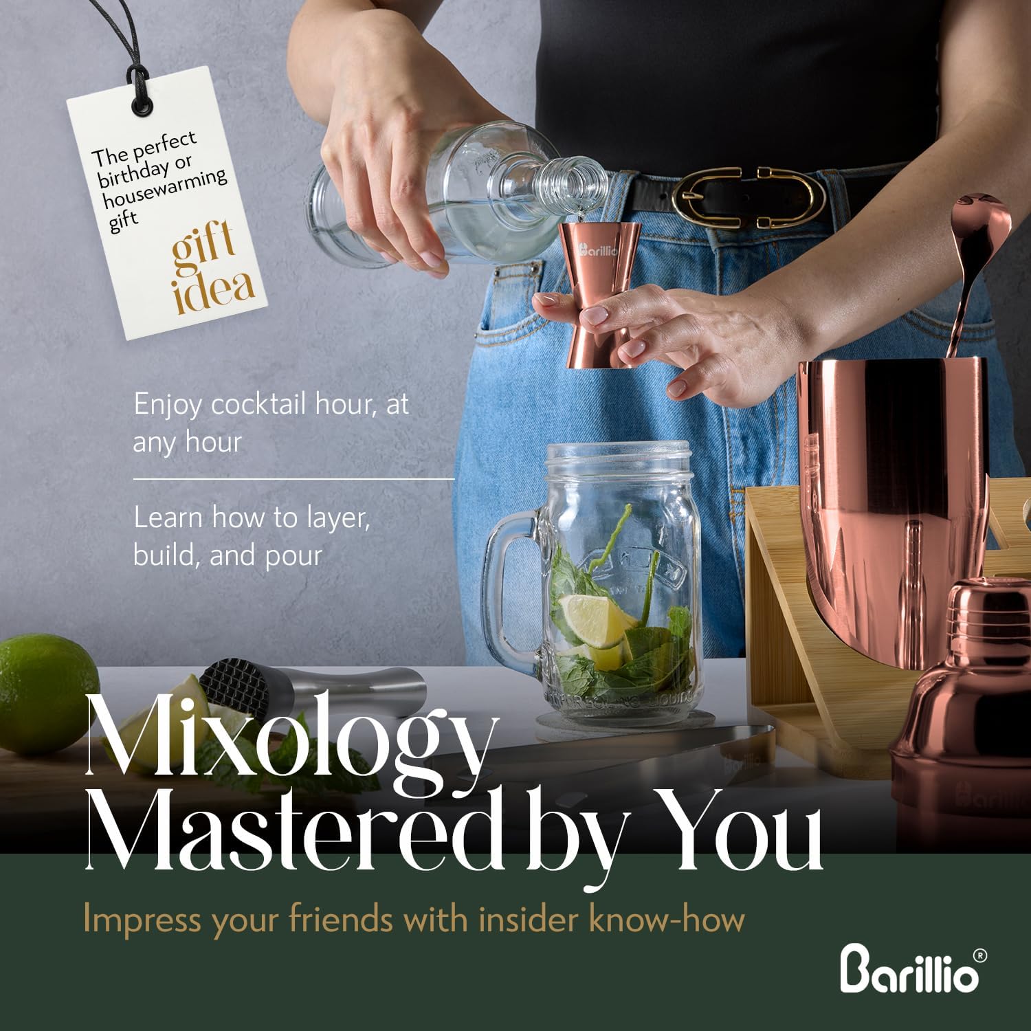 BARTENDING KIT: Barmenler tarafından tasarlanan bu 10 parçalı bar alet seti, göz alıcı gül altın rengi ayna kaplamasına sahiptir ve Japon bambu standında sunulmaktadır. Evinizin rahatlığında lezzetli kokteyller hazırlamak için ihtiyacınız olan tüm bar aksesuarlarıyla donatılmıştır. - BAMBU SAKLAMA STANDI: Sofistike ahşap bambu stand, özel mutfak gereçleri tutucularıyla tasarlanmıştır ve barmenlik malzemeleriniz için mükemmel bir şekilde donatılmıştır. Zahmetsiz bir stil ve işlevsellik sunar.