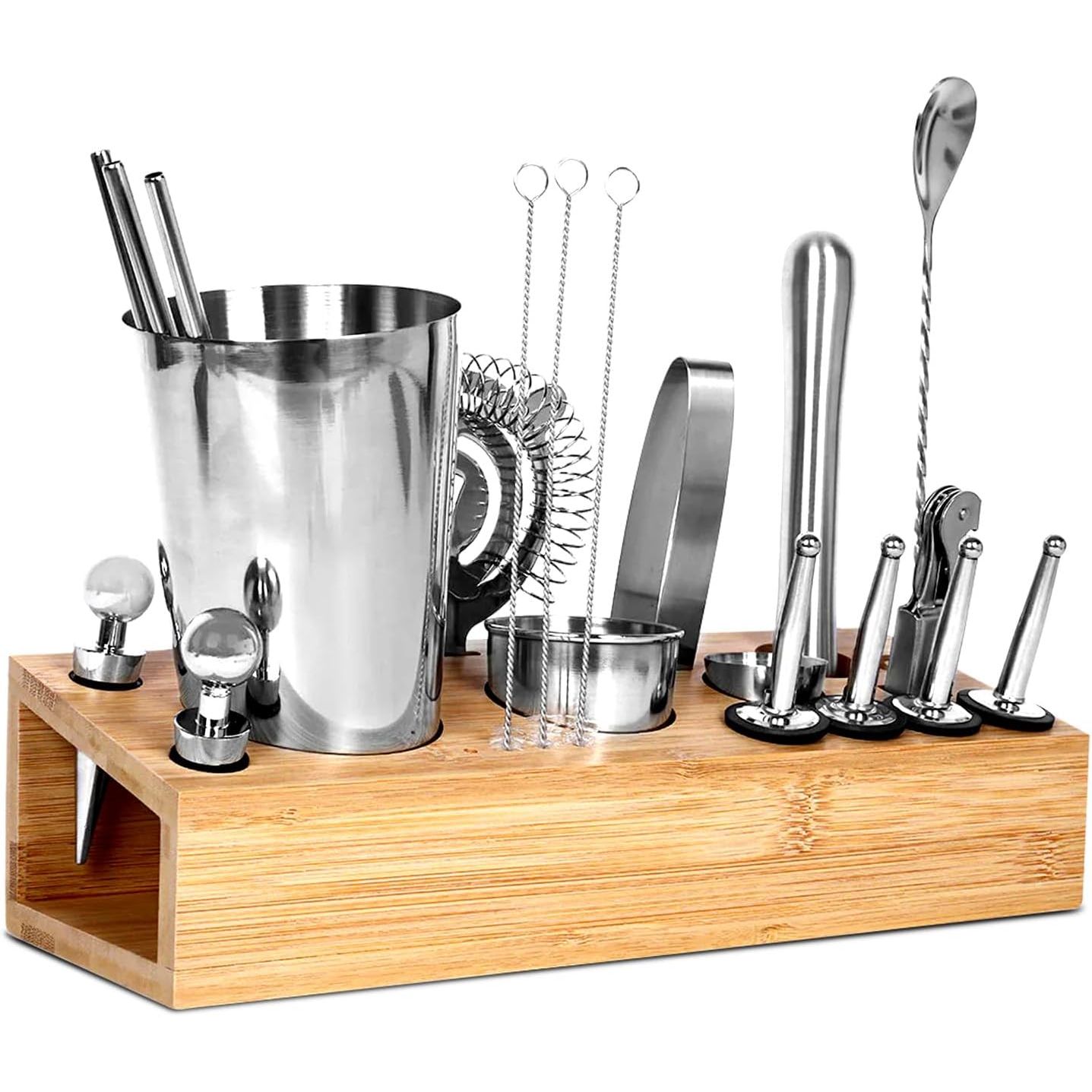 Şık ve Zarif Bambu Stand: Dağınık çekmecelere veda edin. Bu çevre dostu bambu stand, aletlerinizi düzenli ve düzenli bir şekilde sergilemenizi sağlar. Özel yuvalar, her parçanın yerinde kalmasını ve kullanıma hazır olmasını sağlar. - Birinci Sınıf Paslanmaz Çelik Yapı: Gıda sınıfı 18/8 paslanmaz çelikten üretilen her parça, paslanmaya dayanıklı, dayanıklı ve uzun ömürlüdür. Profesyonel barmenlerin güvendiği kaliteyle aynıdır. - Sızdırmaz Kokteyl Çalkalayıcı: Güvenle karıştırın! Çalkalayıcı, sıkı bir contaya sahiptir.