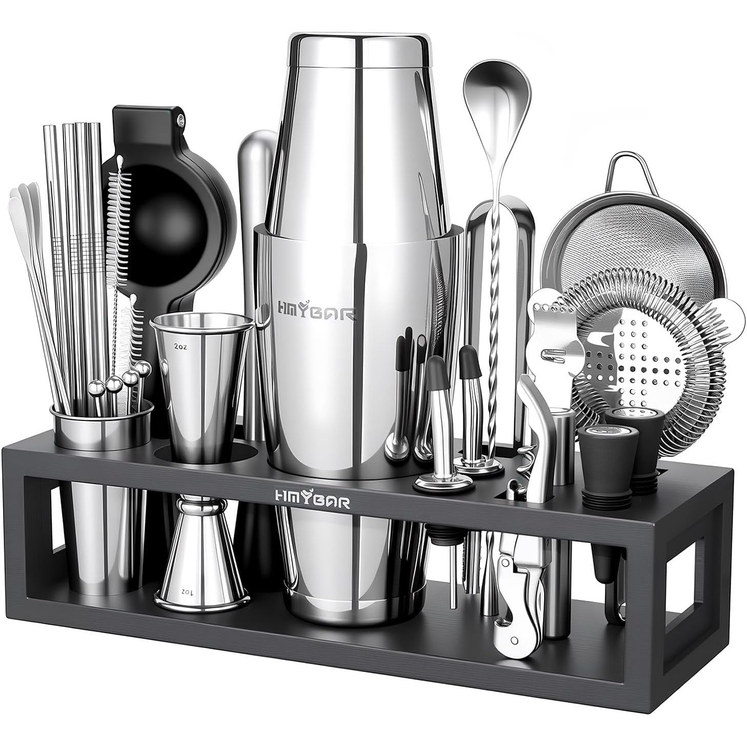 Hem yeni başlayanlar hem de profesyoneller için lezzetli yetişkinlere yönelik alkollü içecekler ve alkolsüz kokteyller hazırlamak üzere ihtiyaç duyabileceğiniz tüm ev barı gereçlerini içeren, eksiksiz, yüksek kaliteli bir barmenlik seti. Bar gereçlerinizi şık bir stand üzerinde asla kaybetmeyin.İster amatör bir başlangıç barmeni ister profesyonel bir barmen olun, erkekler ve kadınlar için mükemmel bir çiftler kokteyl set.