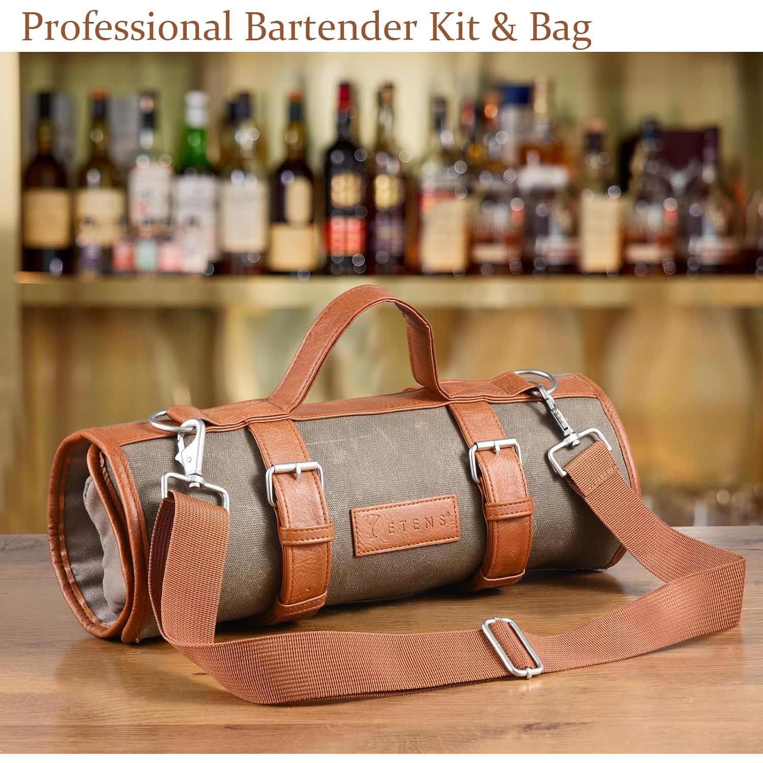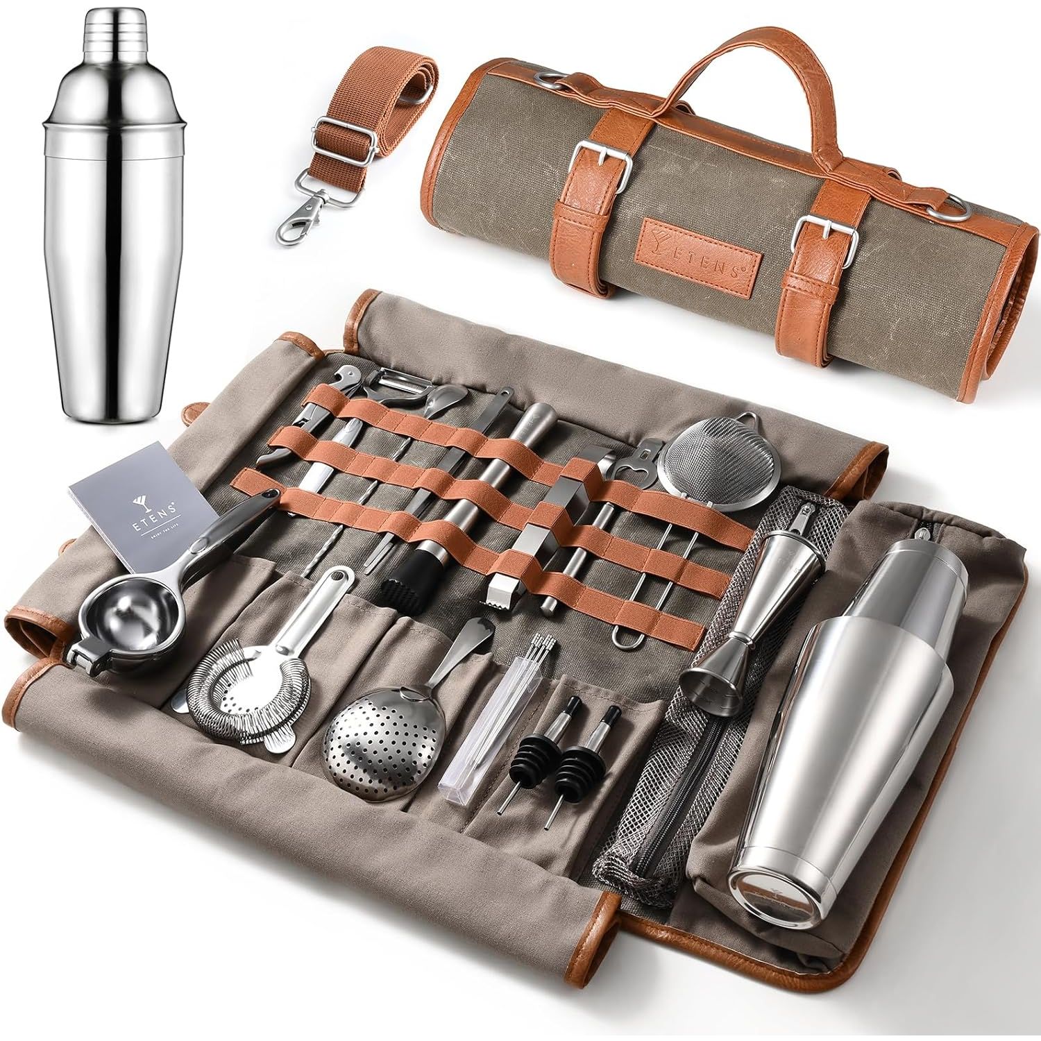 Paket Set: Etens Seyahat Barmen Seti ve Etens ayakkabıcı çalkalayıcı içerir. - Etens Seyahat Barmen Seti: vintage çanta ile tam 22 parçalı barmenlik seti - birinci sınıf paslanmaz çelik bar aletleri, mumlu kanvas çanta. - Klasik Ayakkabıcı Tarzı Kokteyl Çalkalayıcı: Dahili süzgeçli 24 oz martini çalkalayıcı - kolay kullanım. - Ev barı, barmen ve miksolojist için profesyonel, kolay kullanım için tasarlanmıştır. - Metaller için bulaşık makinesinde yıkanabilir; çantanın içini her zaman kuru tutun.