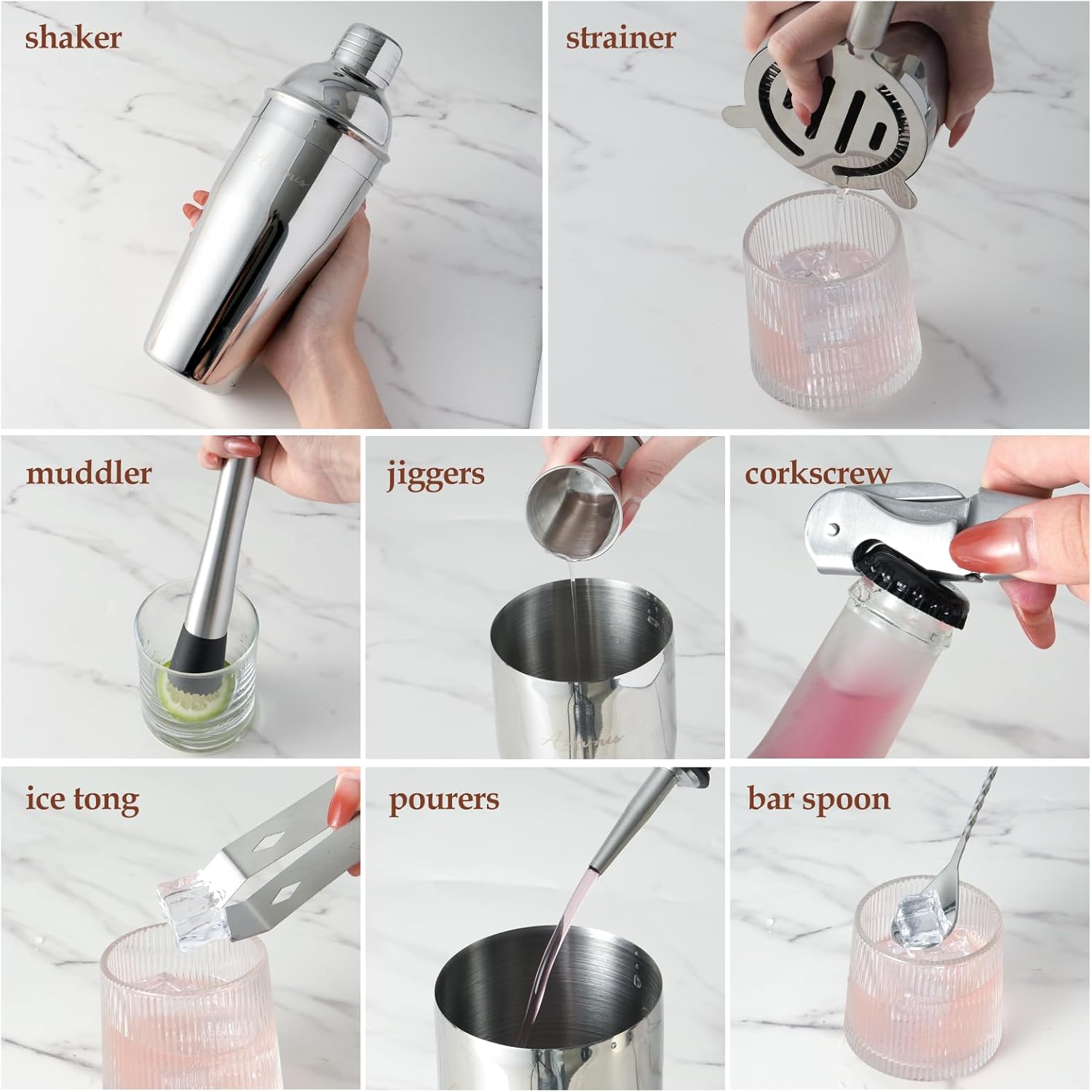 Hepsi Bir Arada Barmen Seti: Bu 23 parçalık eksiksiz set, ev barınız için mükemmel bir temel oluşturur. Klasik ve kokteyller hazırlamak için ihtiyacınız olan tüm temel araçların yanı sıra, zamansız martinilerden modern miksoloji kreasyonlarına kadar her şeyi içeren profesyonel bir tarif kitapçığını da içerir. Ekstra aletlere ihtiyaç duymadan, kutudan çıkar çıkmaz profesyonel bir barmenlik deneyiminin keyfini çıkarabilir ve evde kolayca bar kalitesinde içecekler hazırlayabilirsiniz.