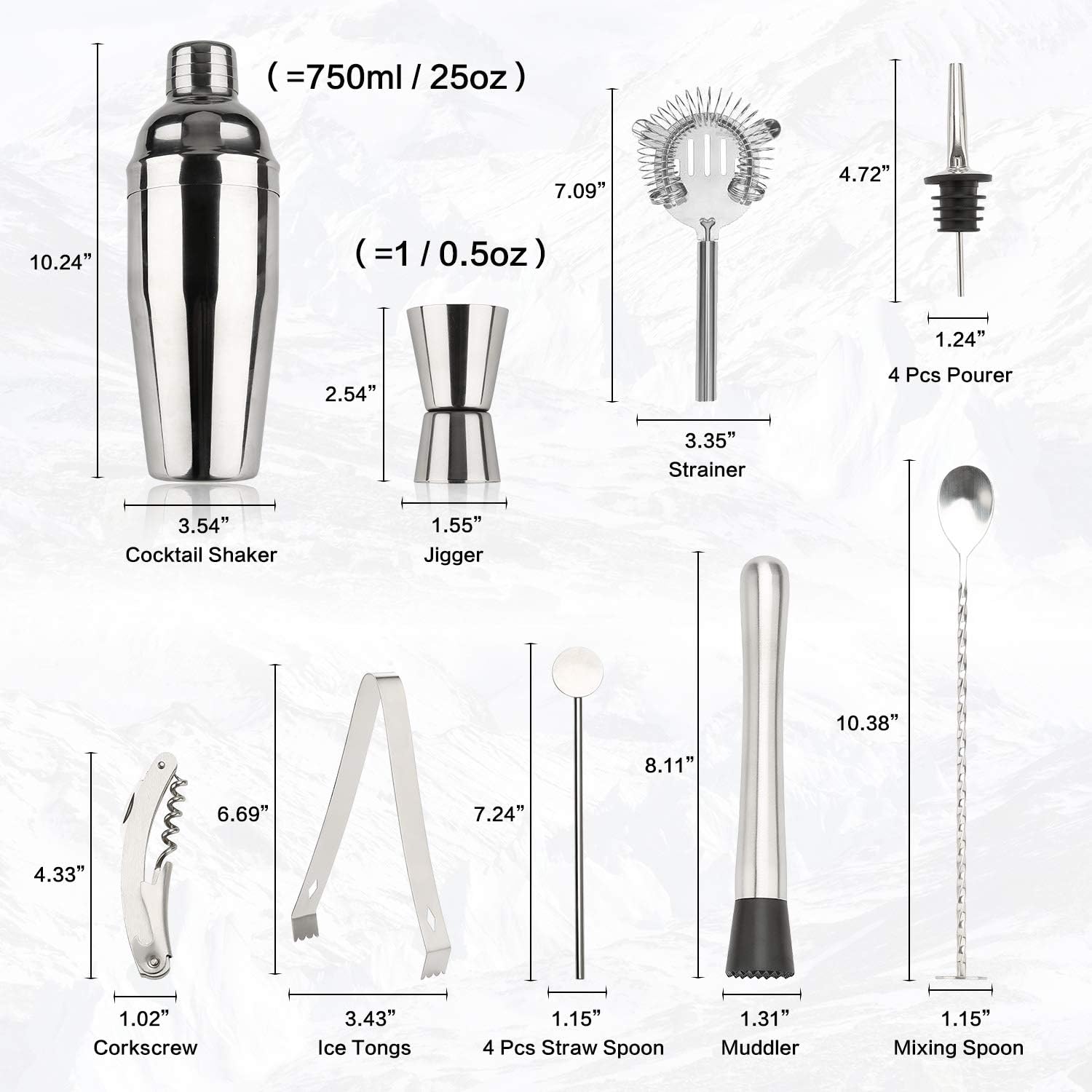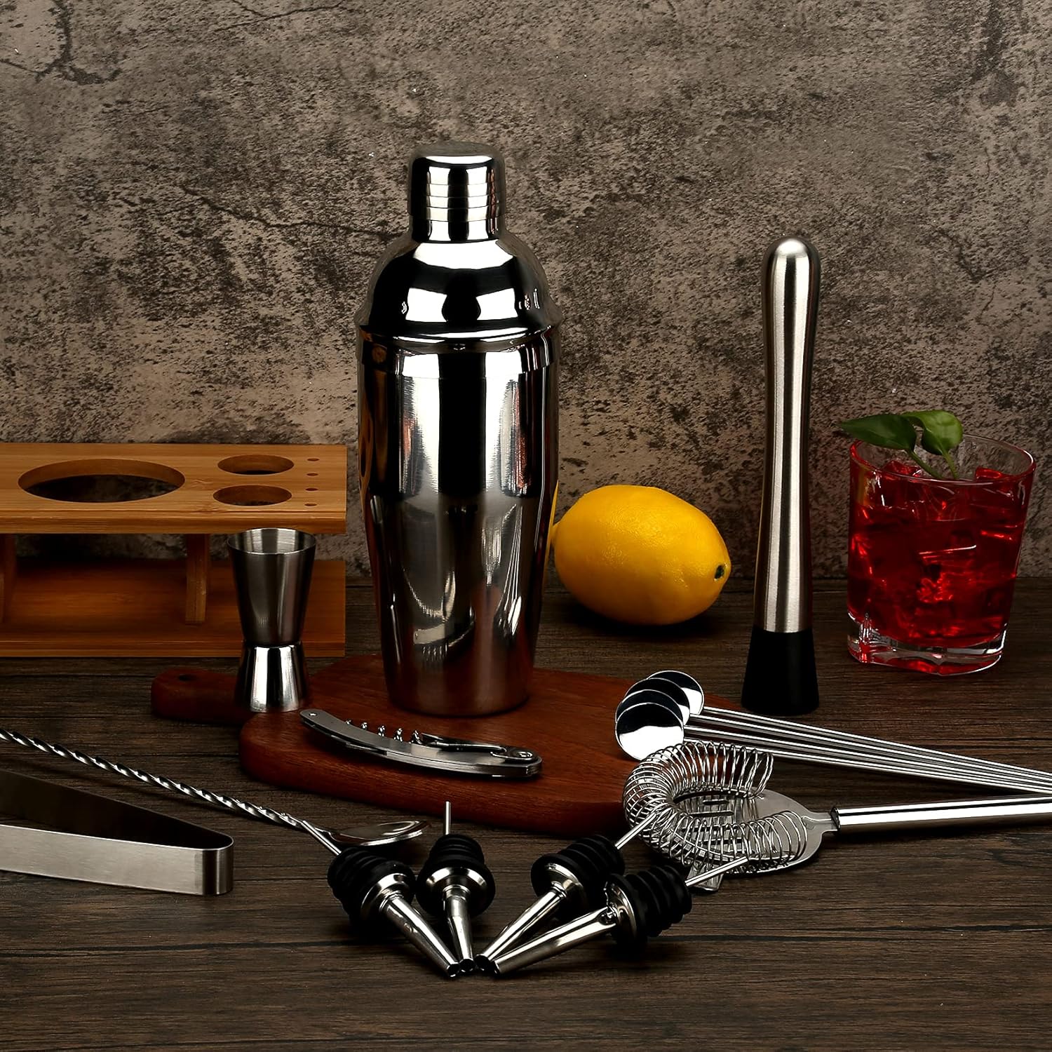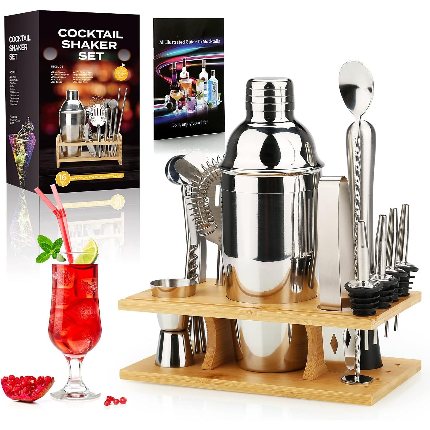 Hepsi Bir Arada Barmen Seti - İçecek hazırlamak için 16 parça bar araç seti, 750 ml içecek çalkalayıcı, süzgeç, çift taraflı ölçü kabı, ezici, kaşık, tirbuşon, maşa, 4 pipet kaşığı, 4 dökücü ve stand, bu kutuda ihtiyacınız olan herhangi bir kokteyl cihazını bulabilirsiniz - Parti Tatil Olmazsa Olmaz - Tatillerde veya partilerde, ister evde kalmayı ister bara gitmeyi seçin, bu kokteyl çalkalayıcı seti size harika bir içki deneyimi yaşatacak, iyi şarabın, iyi müziğin, aileniz ve arkadaşlarınızla güzel zaman geçirmenin tadını çıkaracak.