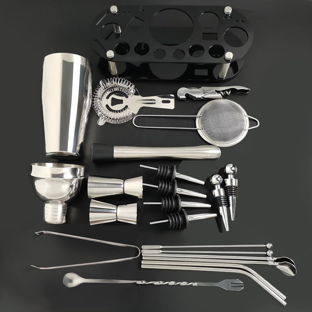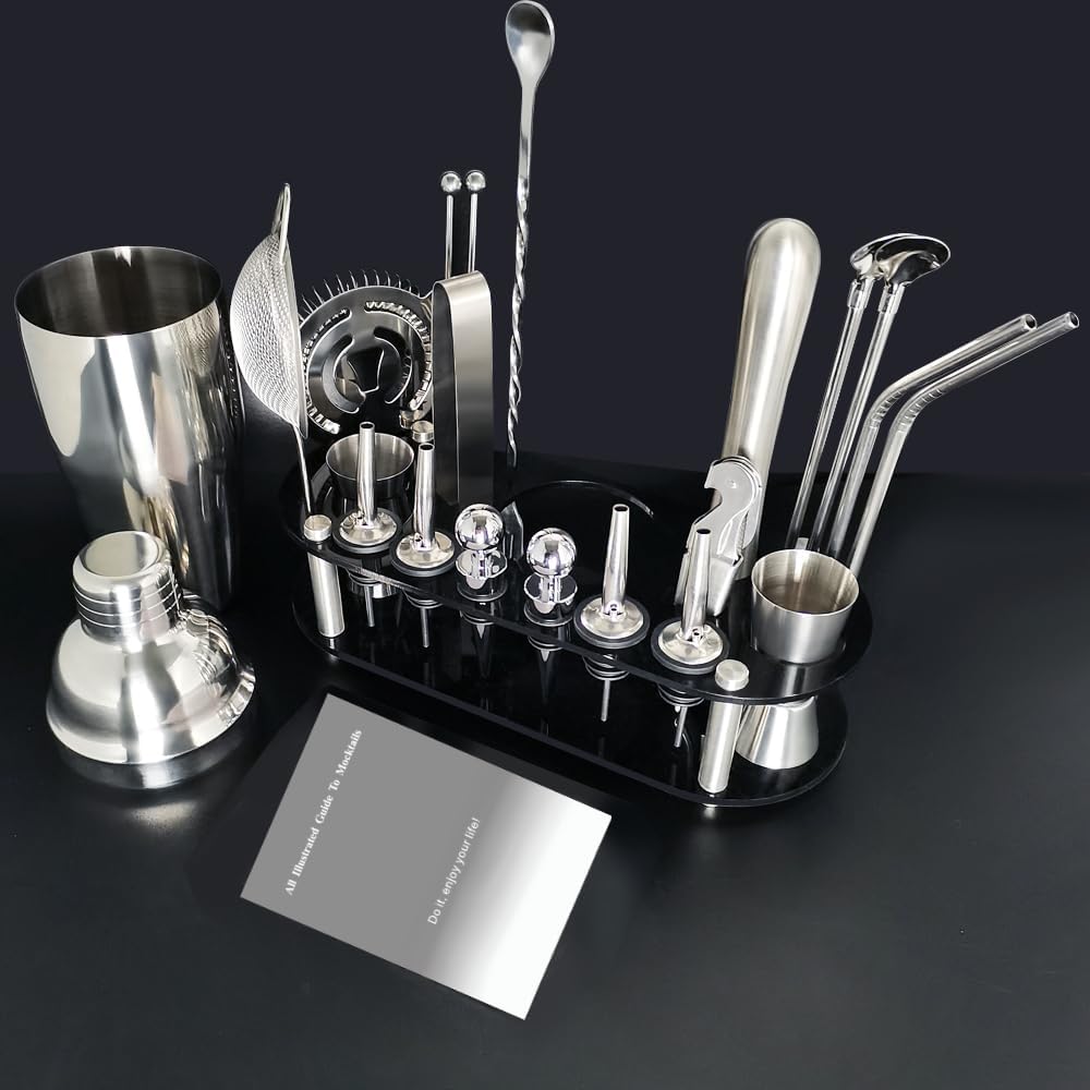 21 Parçalı Barmen Alet Seti İçeriği: 1 x 24 oz Çalkalayıcı, 1 x 25/50 ml Ölçü Kabı, 1 x 15/30 ml Ölçü Kabı, 1 x Buz Süzgeci, 1 x Süzgeç, 1 x Buz Maşası, 1 x Karıştırma Kaşığı, 1 x Çatal ve Kaşık, 1 x Tirbuşon, 2 x Karıştırma Çubuğu, 2 x Pipet Kaşık, 2 x Kavisli Pipet, 4 x Dökücü, 2 x Şarap Tıpası, 1 x Tarif Kitapçığı, 1 x Siyah Akrilik Stand. - Siyah Şarap Standı Akrilik pleksiglas saklama tutucusuna sahip üst düzey kokteyl seti, her alet ve bar eşyası için özel yuvalar bulunur. - Akrilik standlı barmen seti, bar eşyalarınızı çizilmeye karşı güvenli, düzenli ve erişilebilir tutar.