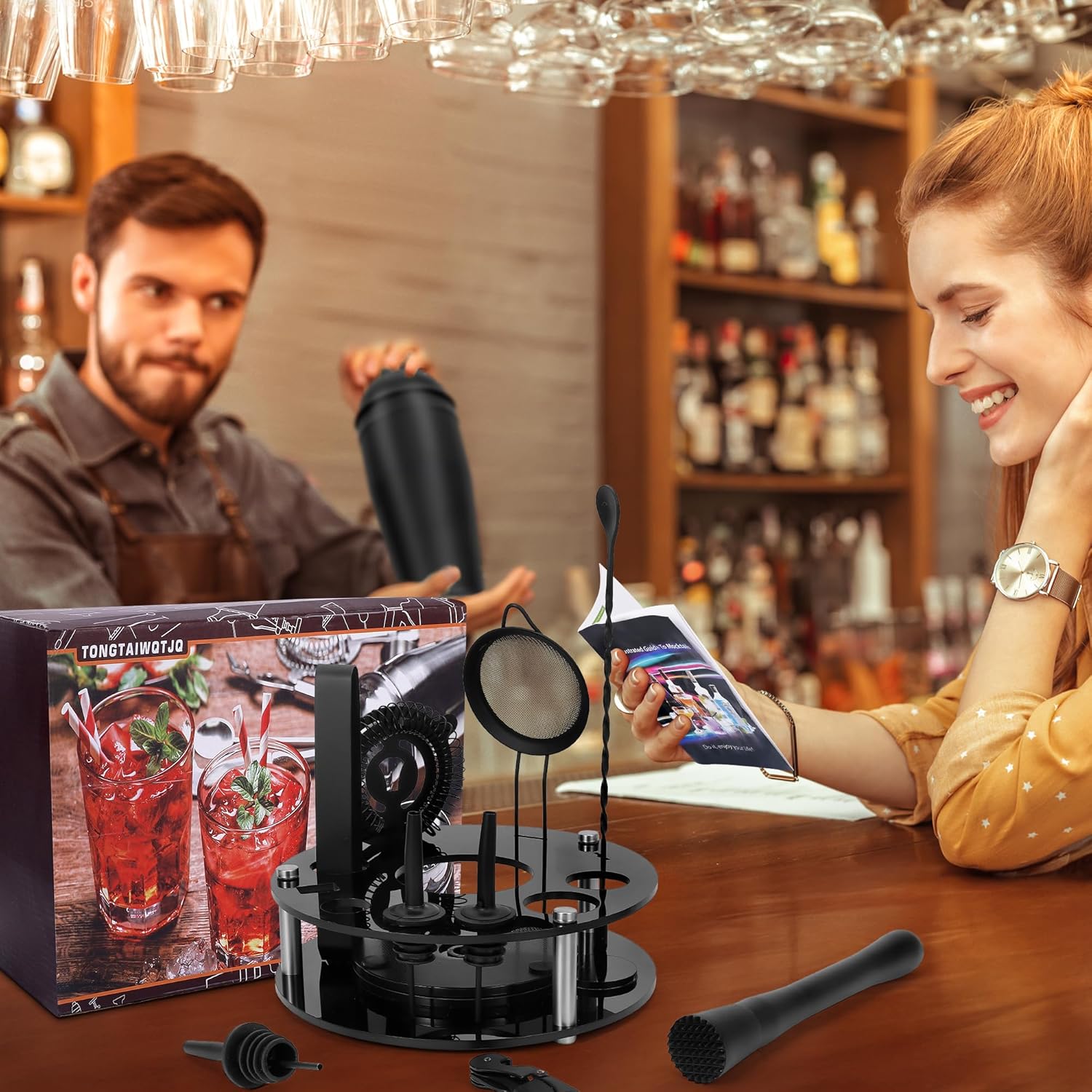13 Parçalı Barmenlik Seti: Bu barmenlik seti, her ev barı için olmazsa olmazdır. Kokteyl süzgeci, tel süzgeç, bar kaşıkları, kokteyl çalkalayıcılar, eziciler, buz maşası, tirbuşon, 3 şişe dökücü, ölçü kabı, kokteyl tarif kitapçığı ve döner stand gibi tüm bar malzemelerini içerecek şekilde özenle tasarladık. Bir sonraki partinizin başarılı geçeceğinden emin olabilirsiniz. Yüksek kaliteli malzeme: Bu siyah kokteyl seti, saklama için hafif plastik bir tabana sahiptir. Kokteyl setindeki aksesuarlar son derece kullanışlıdır.