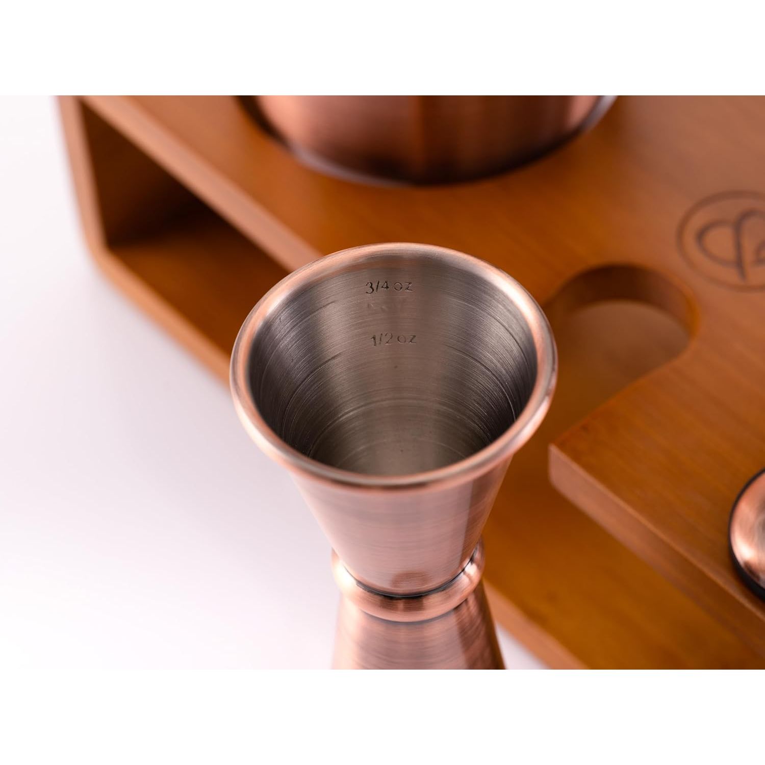 Kompakt Barmenlik Seti: Mükemmel bir kokteyl karıştırma gecesi için ihtiyacınız olan tüm aksesuarlar. Bakır kokteyl çalkalayıcımız, 24 oz Cobbler Shaker, Double (1 oz / 2 oz) Jigger, Hawthorne Süzgeci, Mojito Muddler, Damla Karıştırıcı, Bar Kaşığı ve 2 adet Likör Dökücü gibi temel miksoloji araçlarıyla birlikte gelir; sürdürülebilir kaynaklı bambu standla birlikte içecekleri bir profesyonel gibi hazırlamanızı sağlar. Kokteyl setimiz, gıda ile dayanıklı birinci sınıf malzemelerden üretilmiştir.