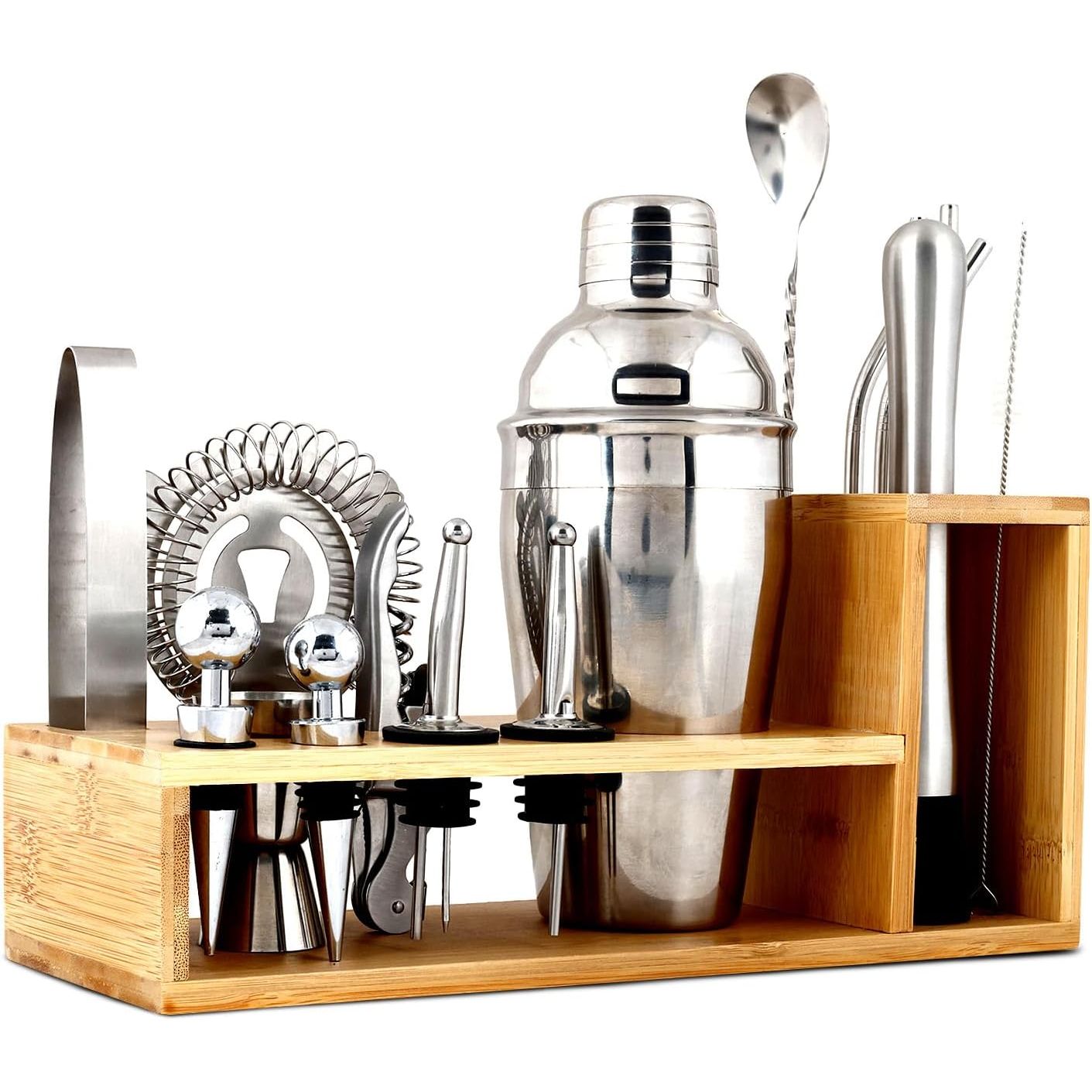 26 PARÇALI PROFESYONEL BAR ALETLERİ SETİ: Bar seti her türlü içeceği karıştırmak için tasarlanmıştır. Kokteyl çalkalayıcı seti, olmazsa olmaz tüm aletleri içerir. Miksoloji barmen seti; kokteyl çalkalayıcı, ölçü kabı, süzgeç, tirbuşon, 2 adet dökme ağzı, 4 kokteyl çubuğu, ezici, bar kaşığı ve kokteyl çatalı, buz maşası ve bambu stand içerir. - MALZEME: Kokteyl seti, uzun ömürlü, hafif ve pas, ezik ve çizilmelere karşı dayanıklı olduğu bilinen gıda sınıfı 18/8 paslanmaz çelikten yapılmıştır