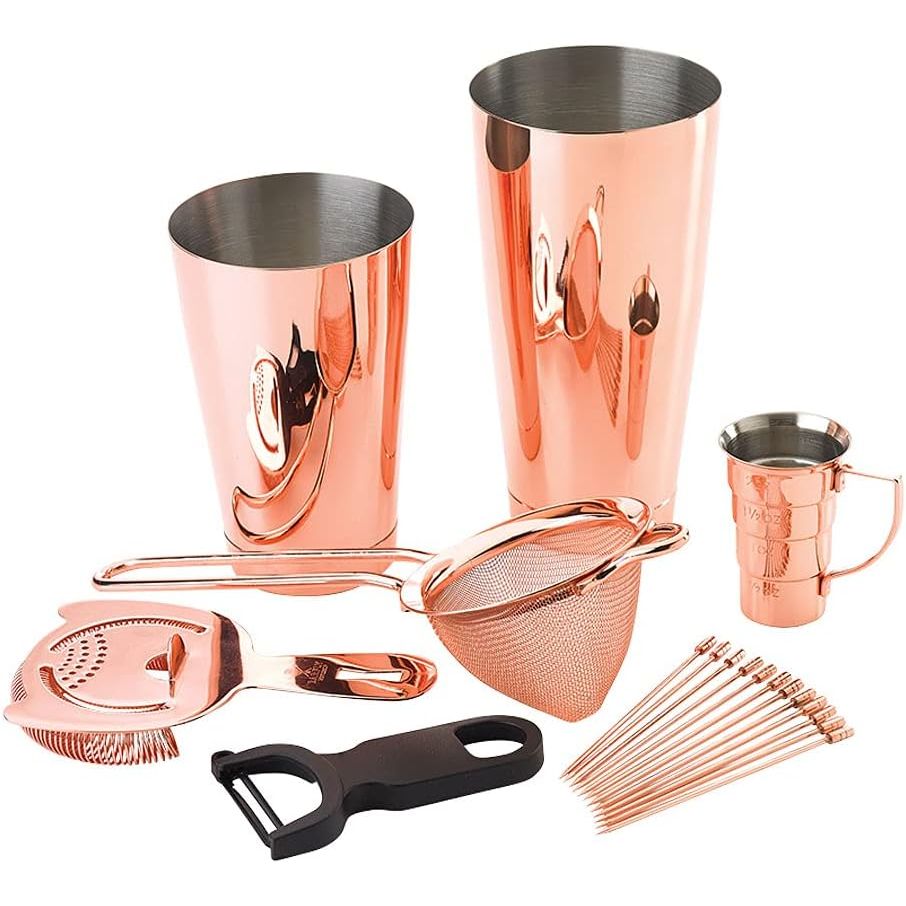BAR EŞYALARI: Her barmenin olmazsa olmazı olan bu set, hazırlıktan bitişe kadar mükemmel çalkalanmış bir Martini yaratmak için gereken tüm temel malzemeleri içerir - KALİTELİ YAPIM: Shaker kutuları, şeklini korumak, aşınmayı gizlemek ve rafine bir görünüm korurken sürekli olarak iyi performans göstermek için ağır hizmet tipi paslanmaz çelikten üretilmiştir - SET İÇERİĞİ: Bakır kaplamalı kokteyl shaker/teneke seti, ağır hizmet tipi bar süzgeci, saplı kademeli ölçü kabı, Y soyacağı, ince gözenekli süzgeç ve kokteyl kürdanları.