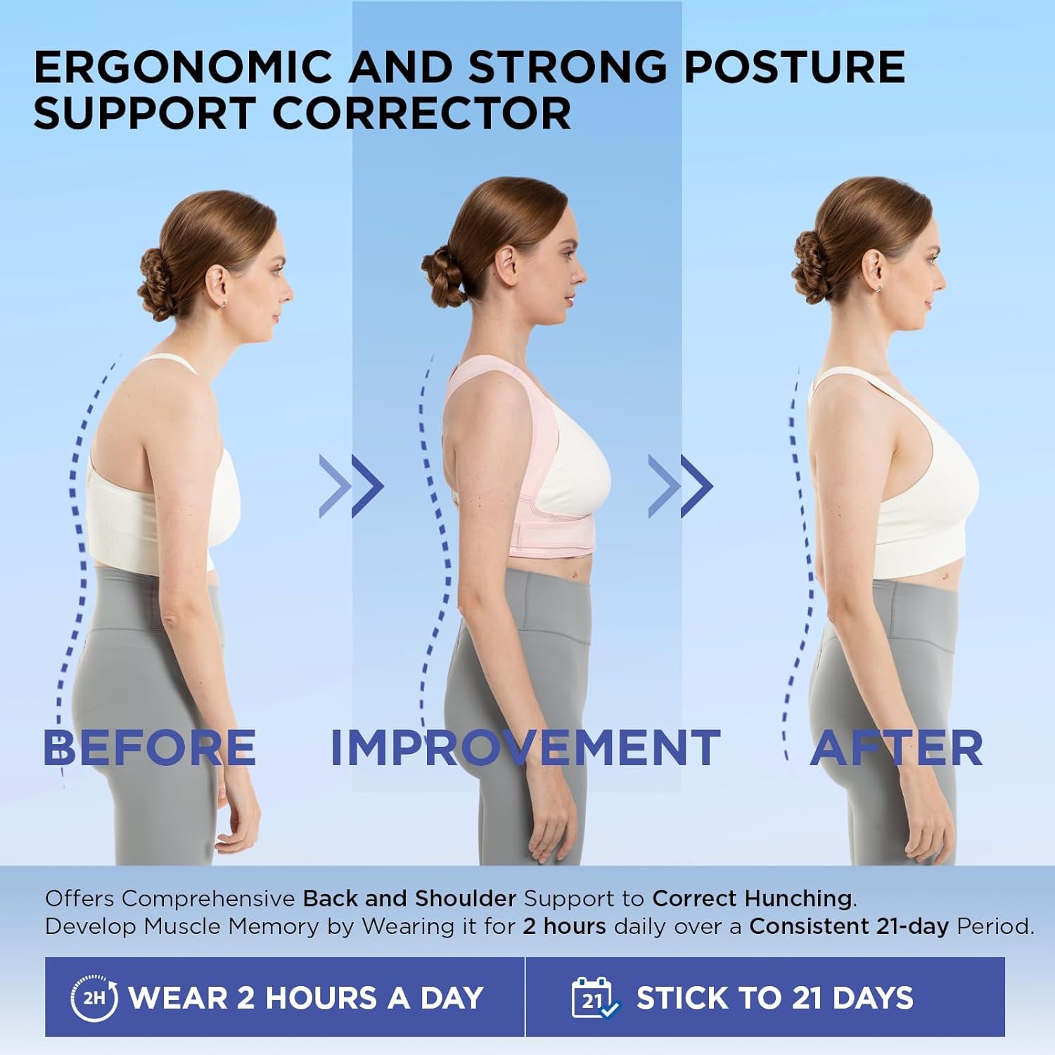 Bu duruş düzeltici korse, kamburluğu azaltmak ve omuzlarınızı nazikçe daha dik bir pozisyona yönlendirmek için tasarlanmıştır. Omuzlarınızı geride tutarak ve vücudunuzu hizalayarak duruşunuzu iyileştirir, gün boyunca kendinizi daha iyi ve daha güvenli hissetmenize yardımcı olur.Duruş destekleyici korse, farklı vücut boyutlarına ve şekillerine kişiselleştirilmiş bir uyum sağlayan tamamen ayarlanabilir omuz askılarına sahiptir.