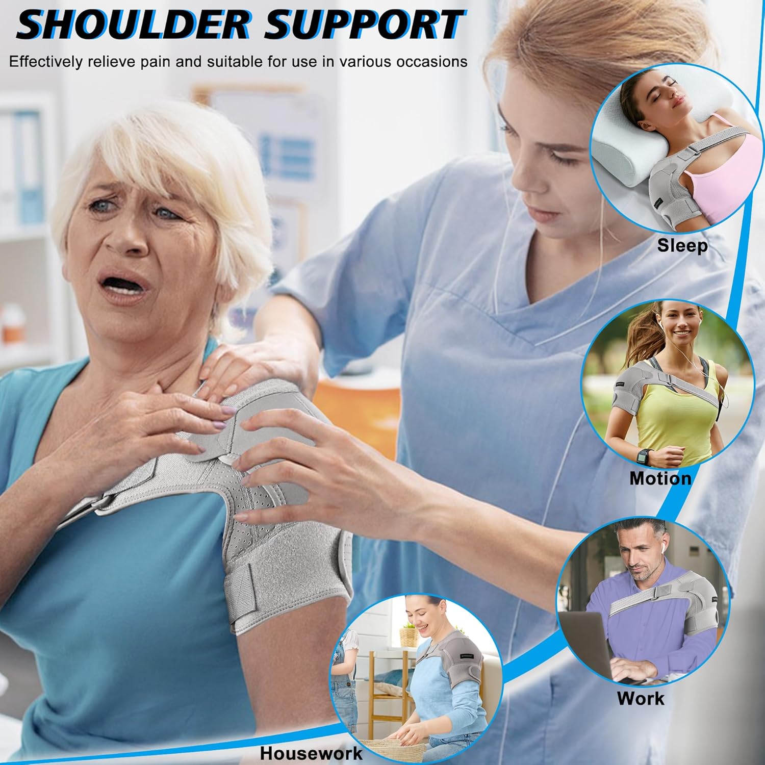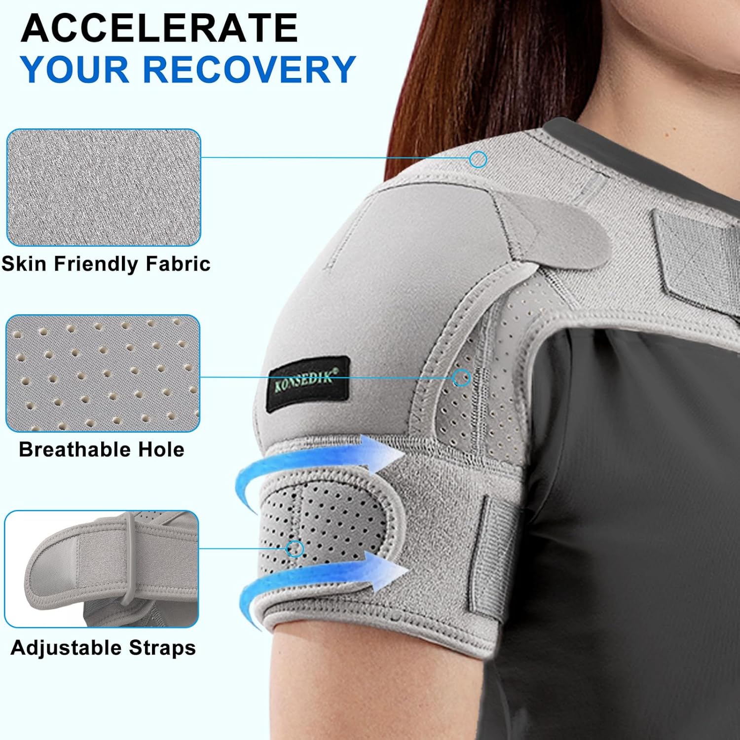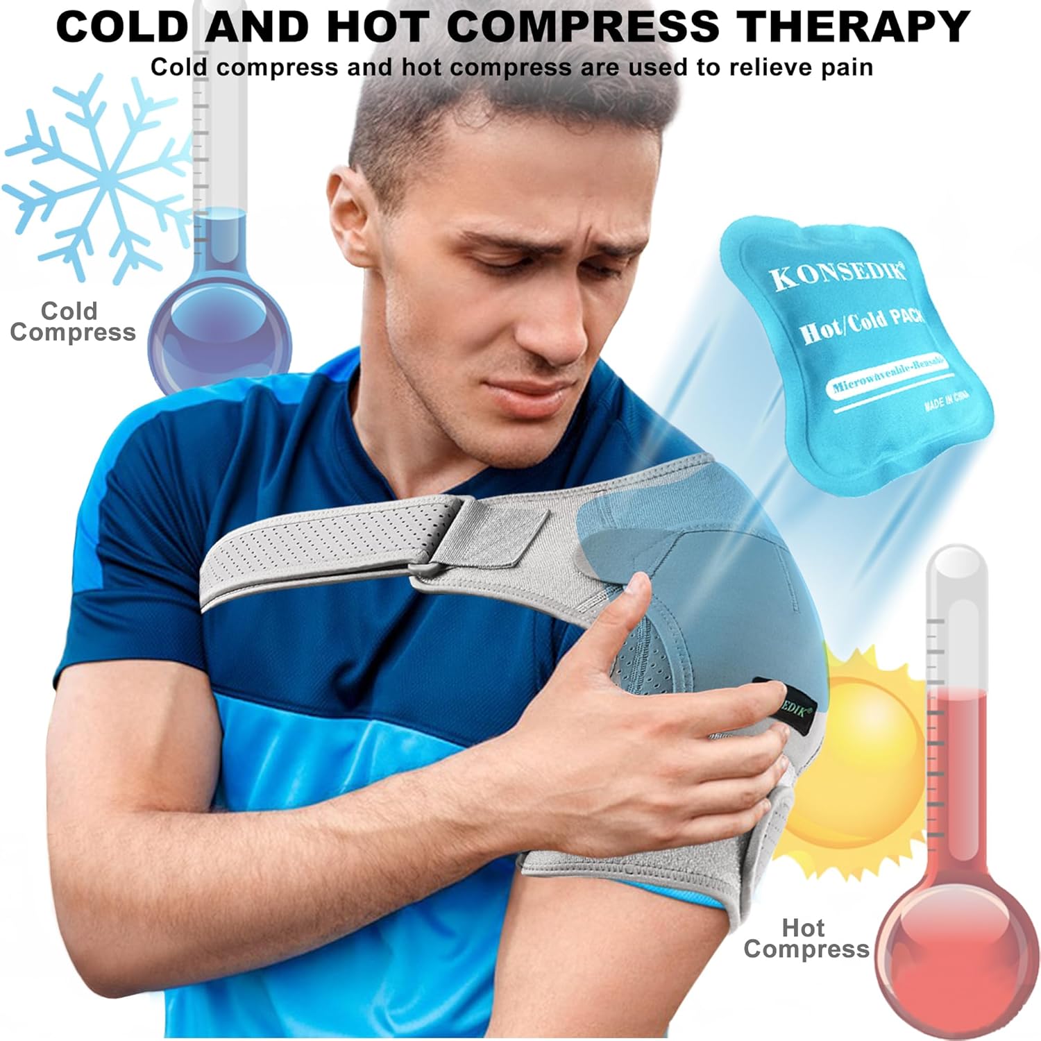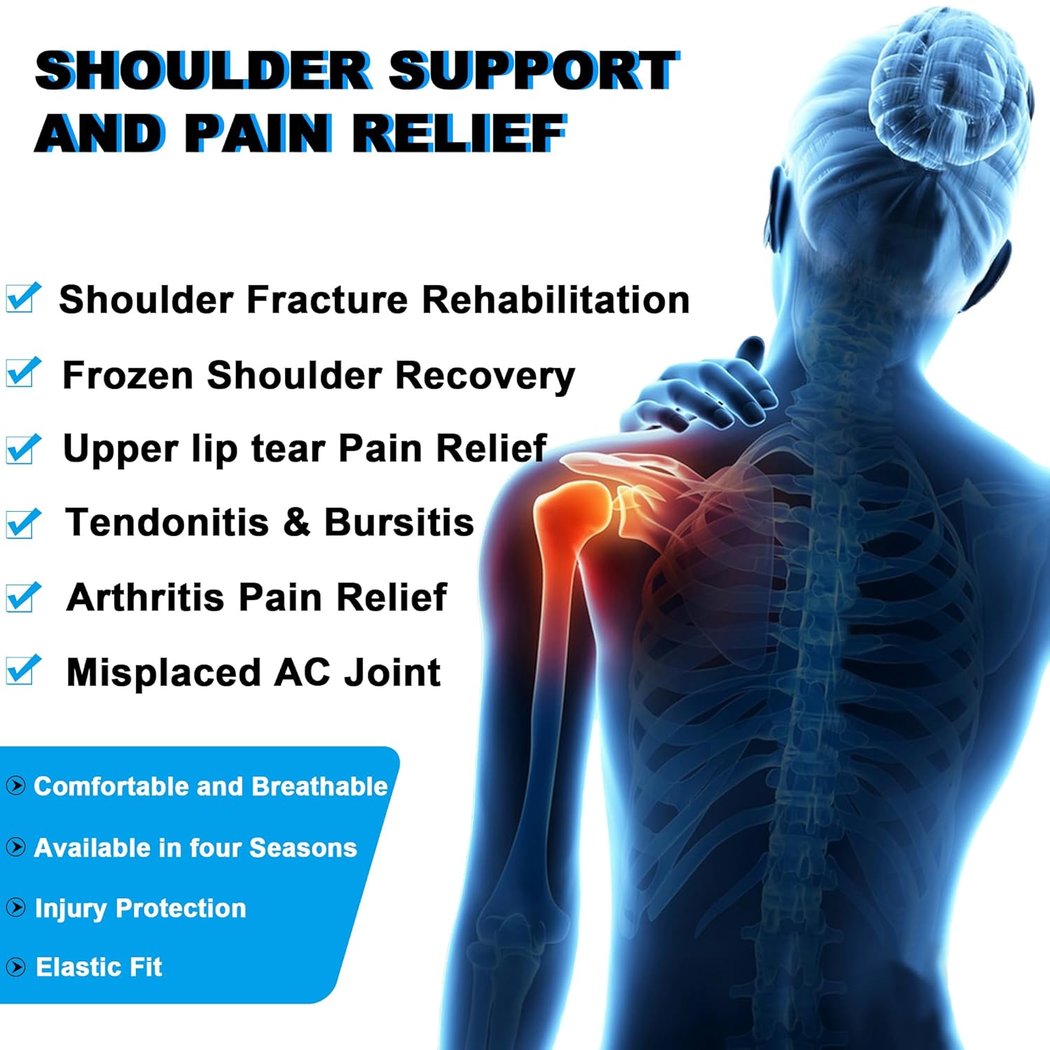 Omuz Desteği, omuza kompresyon uygulayarak yırtık rotator manşeti, omuz çıkığı, AC eklem yaralanmaları, bursit, omuz ağrısı, burkulma, tendinit, artrit, ağrı ve diğer semptomları hafifletebilir.Nefes alabilen omuz destekleri, omuzlara nazik kompresyon uygulayarak kan akışını artırmaya ve iyileşme süresini kısaltmaya yardımcı olur. Sıcak ve soğuk kompreslerde kullanılabilen jel buz paketi ile birlikte gelir, ihtiyacınıza göre seçim yapabilirsiniz.