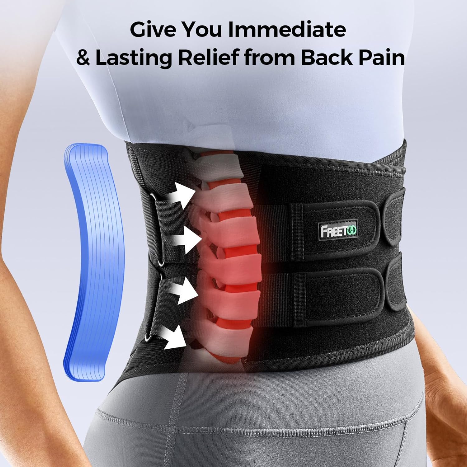 FREETOO sırt desteği hafif hava geçirgen file kumaşla birleştirilmiş metal biyomimetik destek çubukları sayesinde, ağırlık kaldırma, ağır yük taşıma gibi aktivitelerde omurgayı sıkıca destekler ve artrit, disk herniasyonu, siyatik, spinal stenoz, skolyoz, ankiloz, spondilit, ameliyat sonrası sırt ağrısı, spondiloliz, osteoporoz vb. rahatsızlıkların giderilmesine yardımcı olur. Hava geçirgen file kumaş ve anatomik destek şeritleri, sırta yüksek esneklik, nefes alabilirlik ve dayanıklılık sağlayarak vücuda tam oturur.