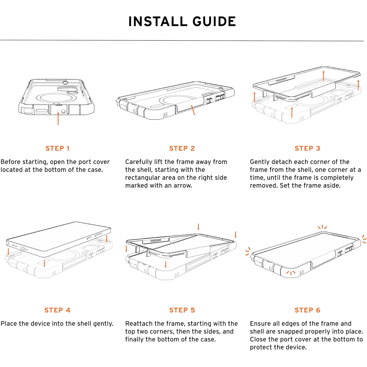 2 Parçalı Tasarım: Bu ultra koruyucu kılıf, sağlam, şeffaf bir arka kısım ve dayanıklı bir ön çerçeve (dahili ekran koruyucu yok) ve kapalı bir şarj portuna sahip iki parçalı bir tasarıma sahiptir. Port kapağı, cihazınızın bağlantısını korumak için kir, toz ve tüyü dışarıda tutmaya yardımcı olur. UAG ekran koruyucularıyla mükemmel uyum sağlar ve çoğu üçüncü taraf seçeneğiyle de uyumludur.
