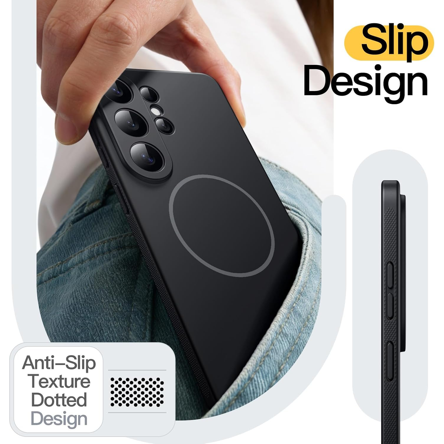 [Kaymaz Tasarım] Yan kısımlarda kaymaz noktalı çizgili doku bulunur; bu, hem rahat bir tutuş sağlar hem de telefonun kaymasını etkili bir şekilde önler.