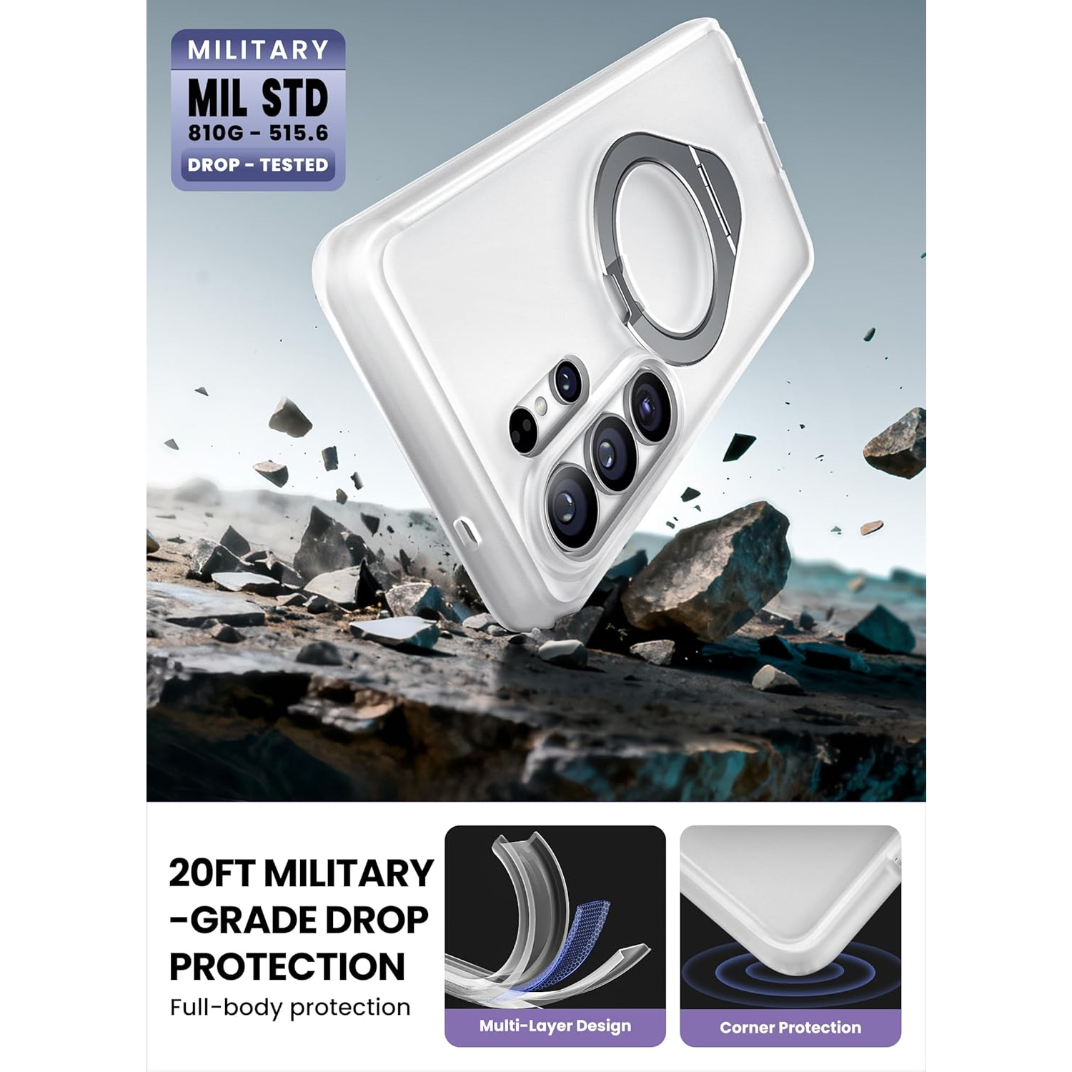 [Askeri Sınıf Düşme Koruması] 360° tam gövde korumasıyla 6 metre yükseklikten düşme testinden geçmiştir ve darbe emilimi için dört köşeli hava yastığı teknolojisiyle güçlendirilmiştir. Yükseltilmiş çerçeveler, kamera lenslerini kazara çizilmelere karşı ekstra koruma sağlar.