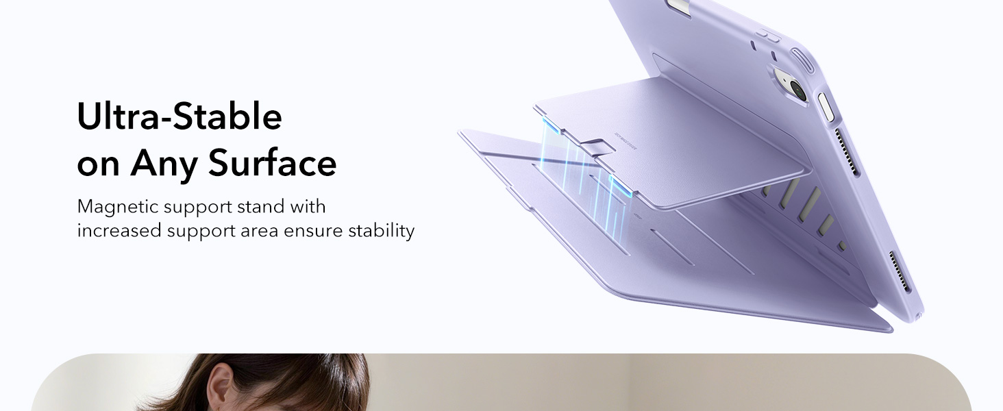 Ultra Sağlam Stand: Geniş kapağı ve güçlü manyetik braketiyle tasarlanan bu 13 inç iPad Air kılıfı, kanepe, yatak, eller veya hatta kucağınızda olsun, her yüzeyde sabit durarak kaymadan dik kalmasını sağlar.